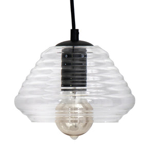 LumiSource Torus Pendant Lamps feature industrial styling with ribbed clear glass shades in saucer, triangle, and long shapes. Ideal for indoor ambient lighting, they include a 60W Edison bulb and offer customizable cord length up to 60 feet for versatile decor accents.