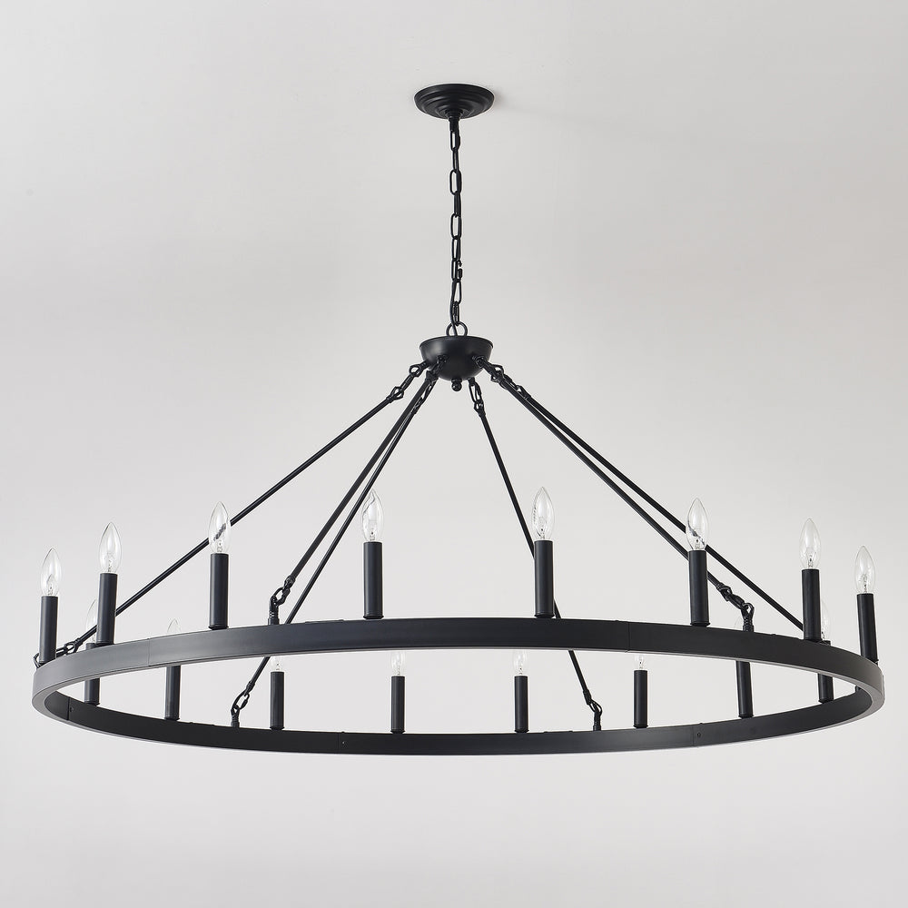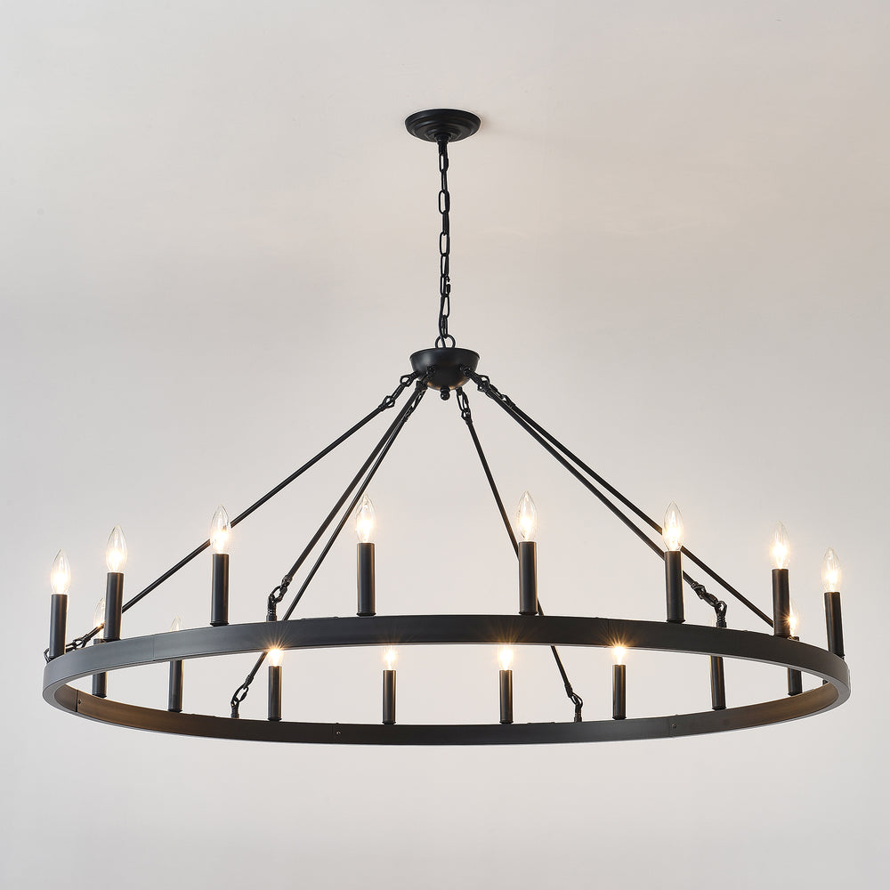 Make a bold statement with this farmhouse industrial chandelier, designed to bring warm ambiance and eye-catching style to your dining room, living room, or entryway. Featuring a striking black iron wagon wheel frame, this large 53-inch pendant light boasts 18 candle-style bulbs that deliver 360° illumination, enhancing any space with bright, inviting light. The adjustable chain allows you to customize the height up to 50 inches, perfect for high ceilings and open floor plans. Easy to install with a pre-assembled lamp body, this chandelier combines rustic charm and modern function, making it a lasting centerpiece in your home. Elevate your interior design and brighten your favorite rooms today.