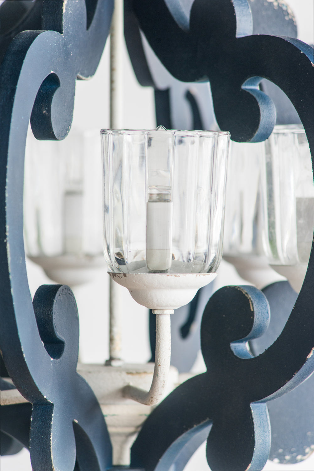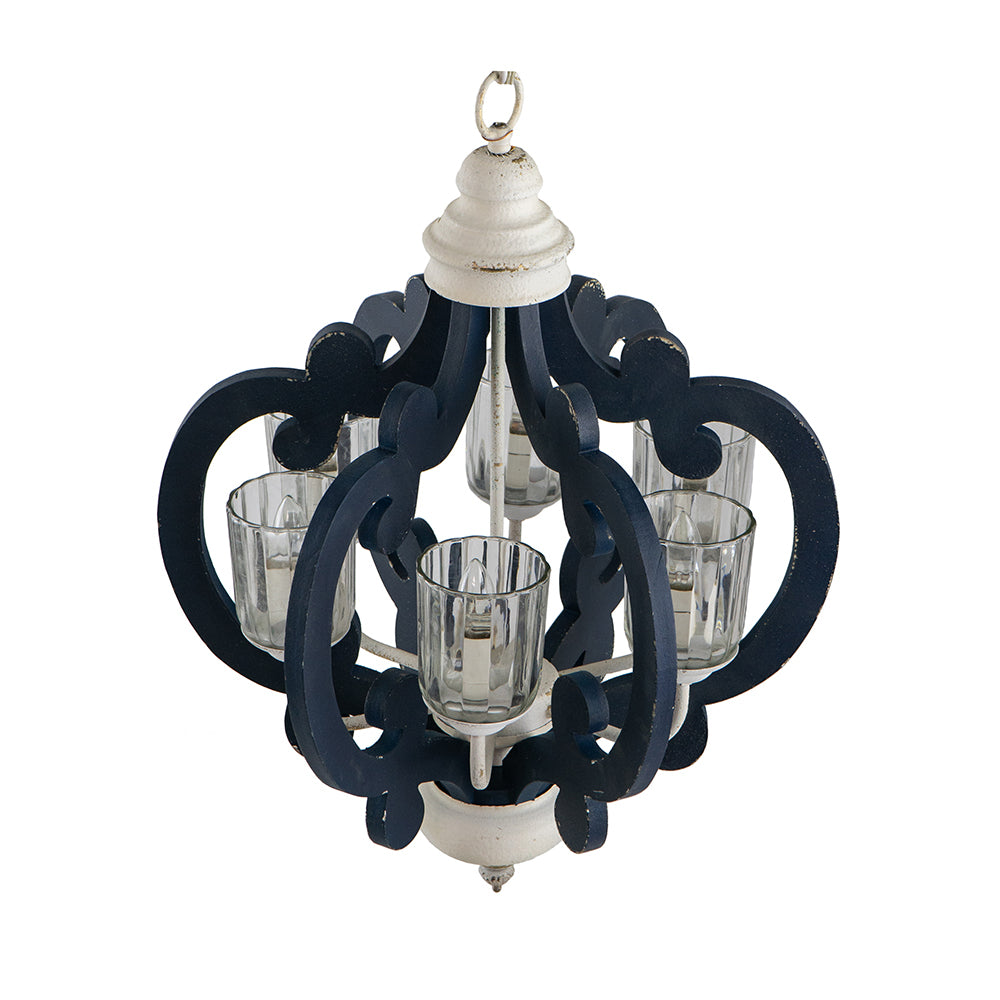 Omega Lifestyles blue wooden chandelier with white accents features six light sources and a hardwired 110V power supply. Crafted from MDF, iron, and glass, its cottage-style design suits kitchens, dining rooms, or coastal living spaces.