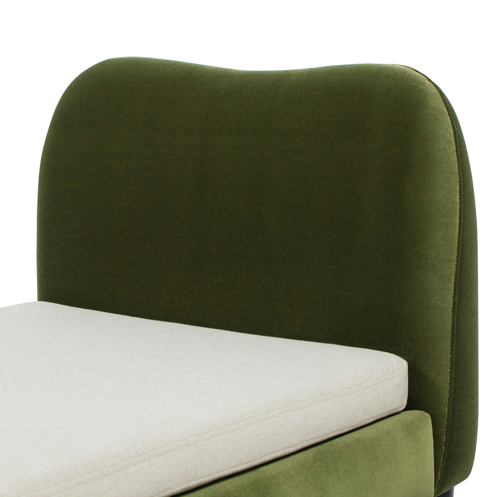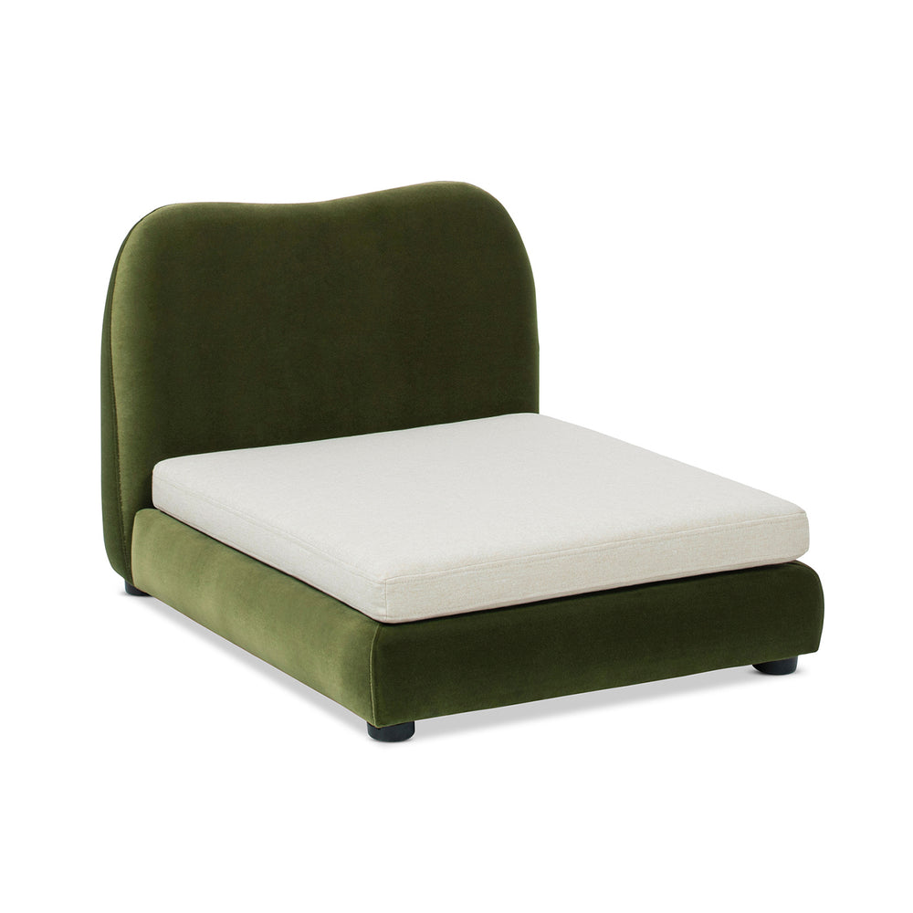 Olive Green velvet pet bed features an upholstered backrest and thick, removable foam cushion for cozy comfort. Its low-profile design and sturdy wood frame are ideal for small to medium dogs and cats, complementing modern home interiors.
