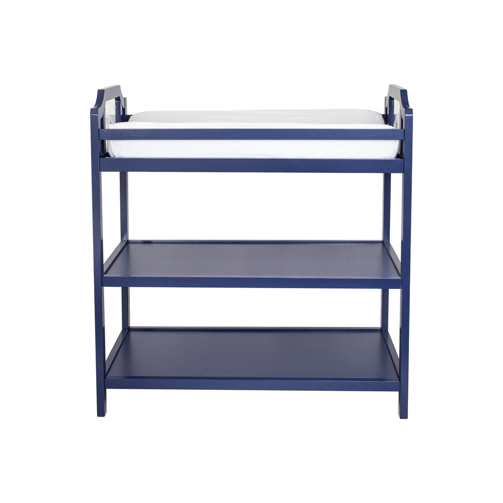 Designed for busy parents, the Celeste Changing Table combines style and function to simplify diaper changes. Crafted from sturdy solid wood, its navy blue finish adds a modern touch to any nursery decor. Thoughtfully sized at 34.25 inches long, 18.75 inches wide, and 36 inches high, it provides a comfortable height for safe and convenient baby care. Multiple storage shelves keep diapers, wipes, and essentials organized and within reach, making every change smooth and efficient. Lightweight yet durable at 28 pounds (12.7 kg), this changing table balances portability with lasting quality. Streamline your nursery setup and elevate your baby care routine with this trusted piece.