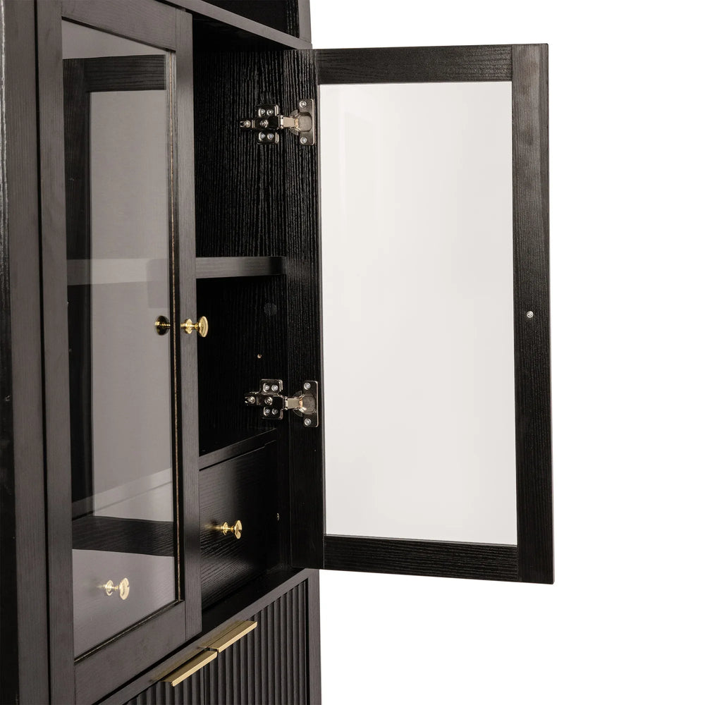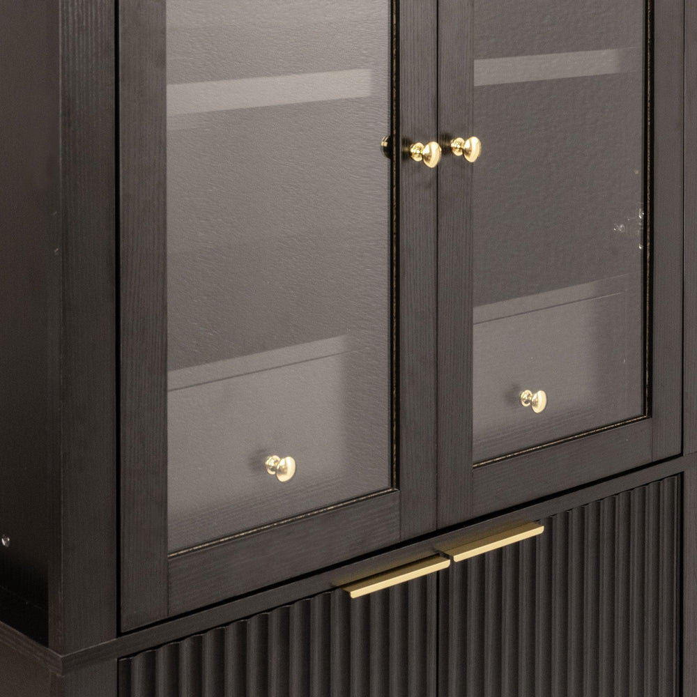 This modern pantry cabinet features elegant vertical fluting, tempered glass doors, and adjustable shelves for customizable storage. Its smooth drawer slides, metal handles, and anti-tip kits ensure durability and safety, ideal for kitchen, dining room, living room, or entryway organization.