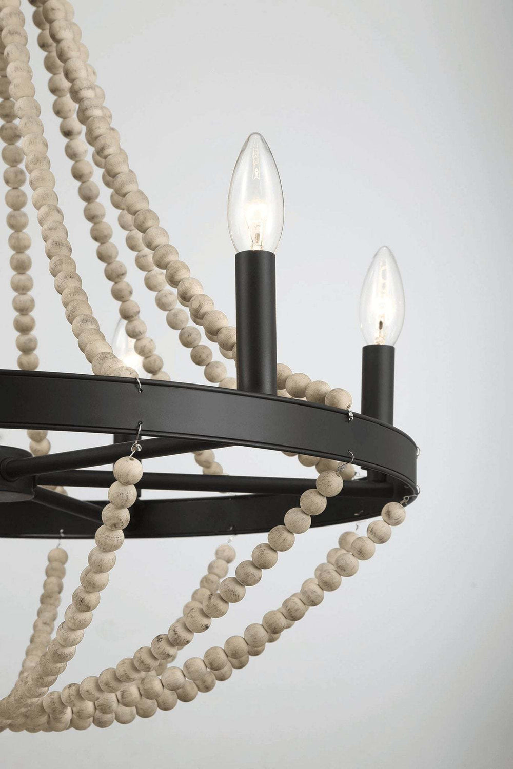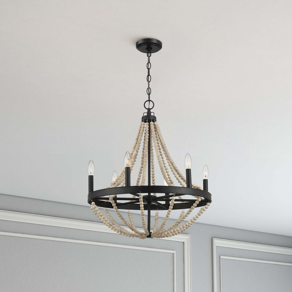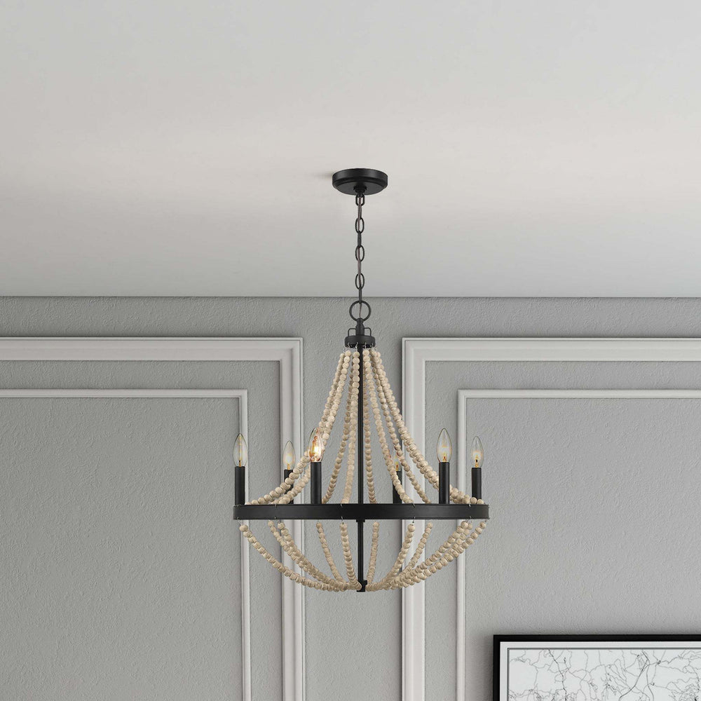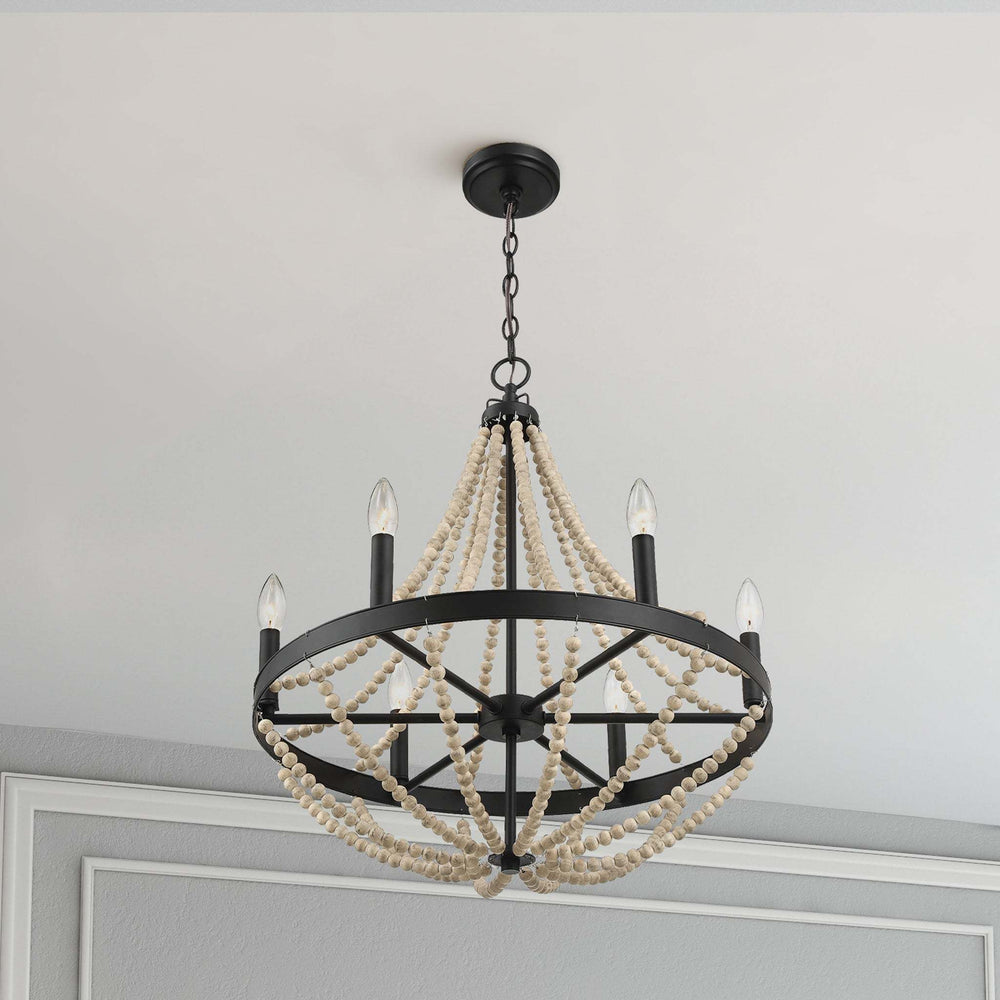 Starry Wood Chandelier features six E12 candle-style lights with wood bead accents, casting a warm farmhouse glow. Crafted from glass, metal, and wood with a black painted metal base, it creates cozy dining room ambiance and adds rustic elegance to any space.