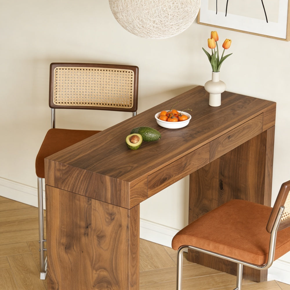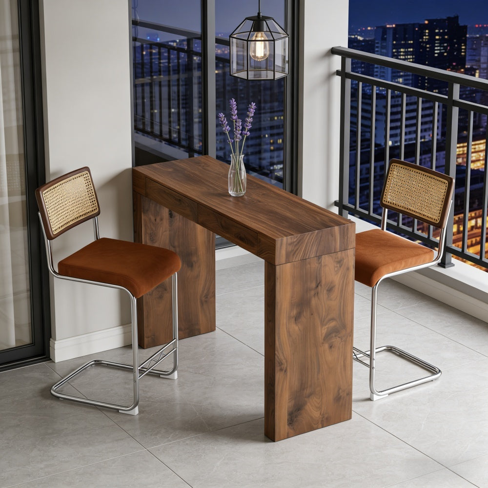 Combine style and functionality with this elegant bar chair and table set, perfect for restaurants, cafes, or stylish home bars. The rich walnut wood grain table adds warmth and character, crafted from high-quality MDF with a natural texture finish. Two plush velvet bar chairs offer superior comfort with their high-density sponge cushions, ensuring you can relax for hours. Featuring a sturdy metal frame and rattan backrests, these chairs bring a modern twist to classic design. The bar table includes two practical drawers to keep essentials organized and your surface clutter-free. Designed with ergonomic height and a compact footprint (50 x 15.3 inches, 37 inches tall), this set fits seamlessly into various indoor spaces. Simple assembly instructions mean you can set up your stylish bar area quickly. Upgrade your space and create inviting seating that blends comfort and sophistication effortlessly.