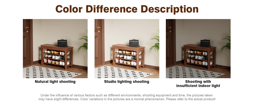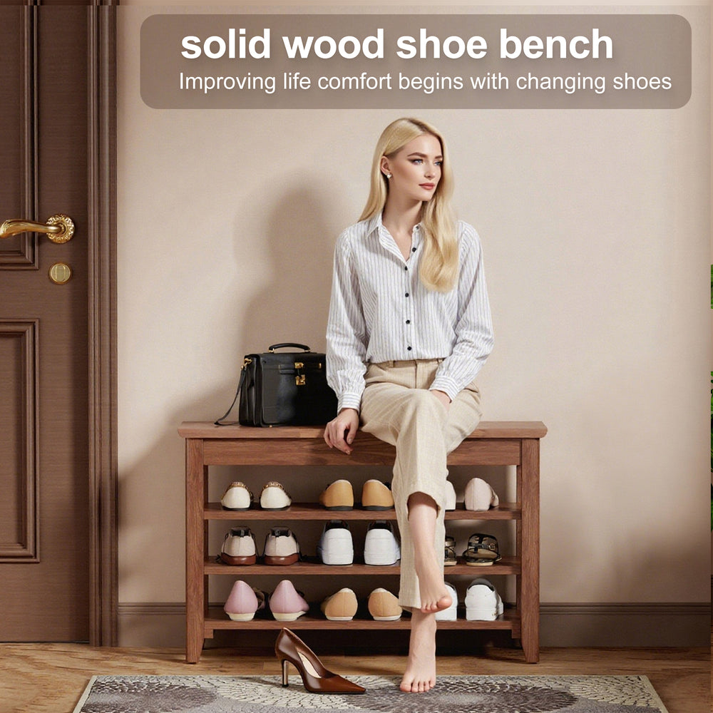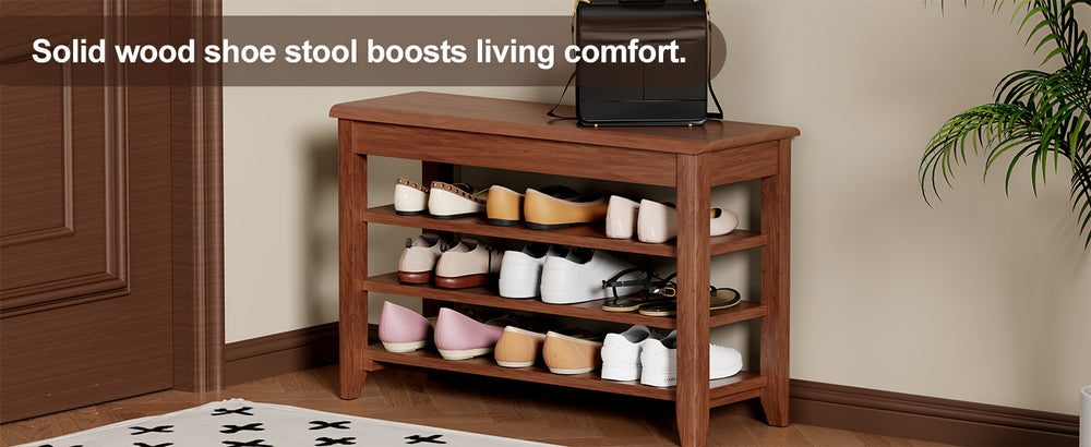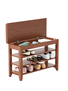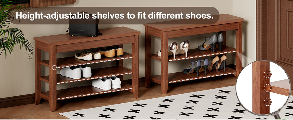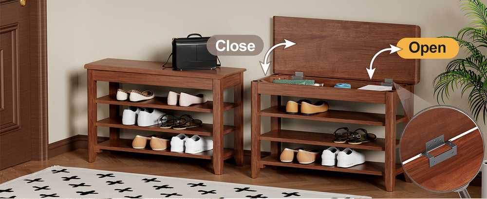Maximize your space and add stylish functionality to your home with this 100% solid wood shoe rack bench. Crafted from durable walnut-finished solid wood, it combines robust construction with natural elegance. The spacious flip-up compartment stores small essentials like socks and keys, keeping your entryway clutter-free and organized. Designed with a comfortable seating height, it’s perfect for putting on or taking off shoes. Adjustable three-tier shelves hold 6 to 10 pairs of shoes, accommodating your entire footwear collection with ease. Supporting up to 550 pounds, this shoe bench offers stability and strength for daily use in busy areas such as entrances, corridors, or bedrooms. Its clean, mid-century modern design fits seamlessly with a variety of décor styles. Elevate your home storage and seating solution today.