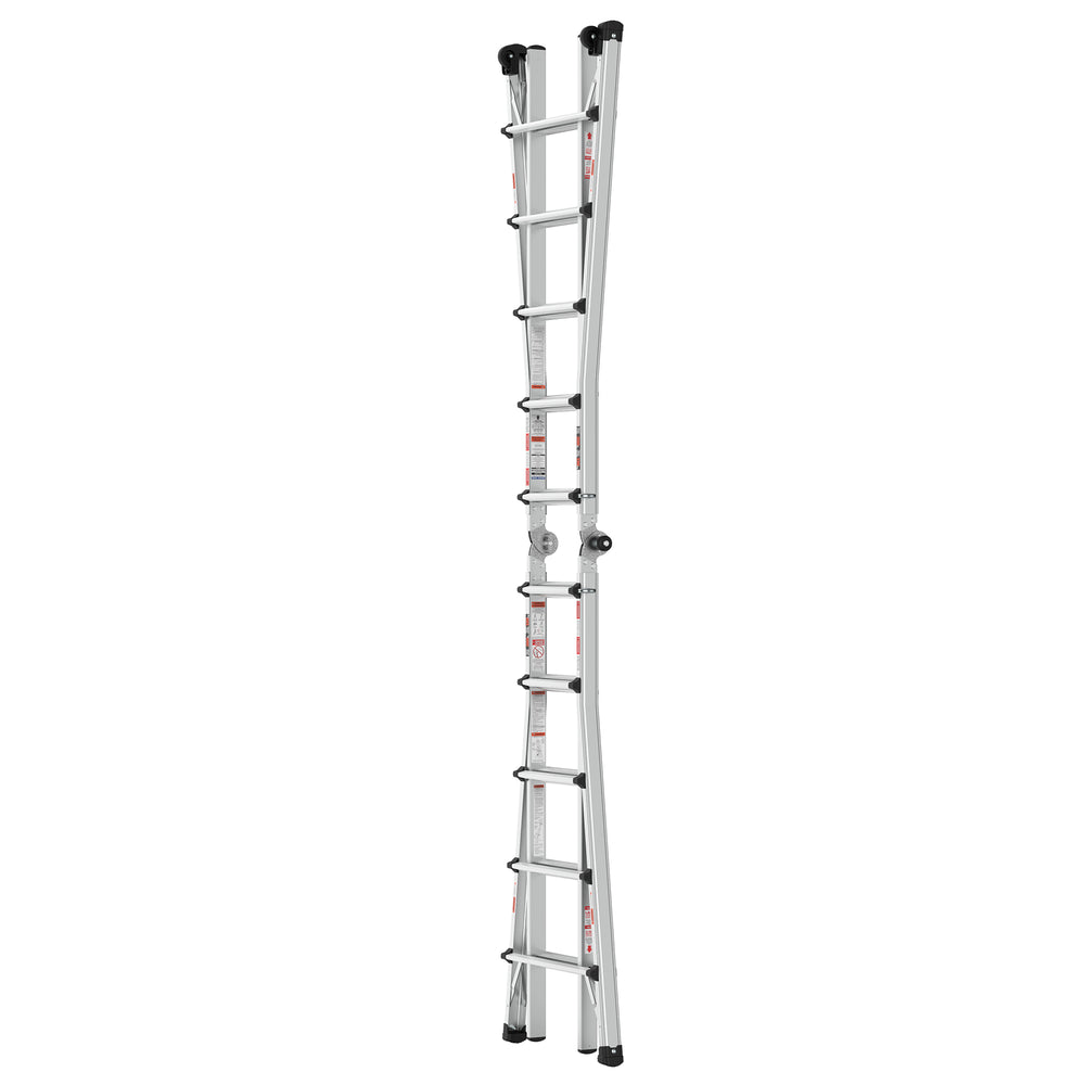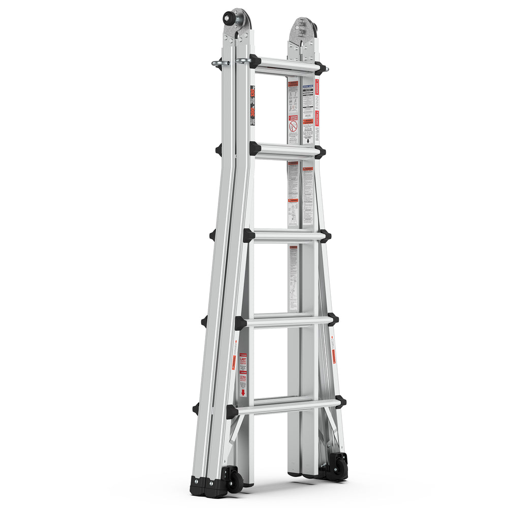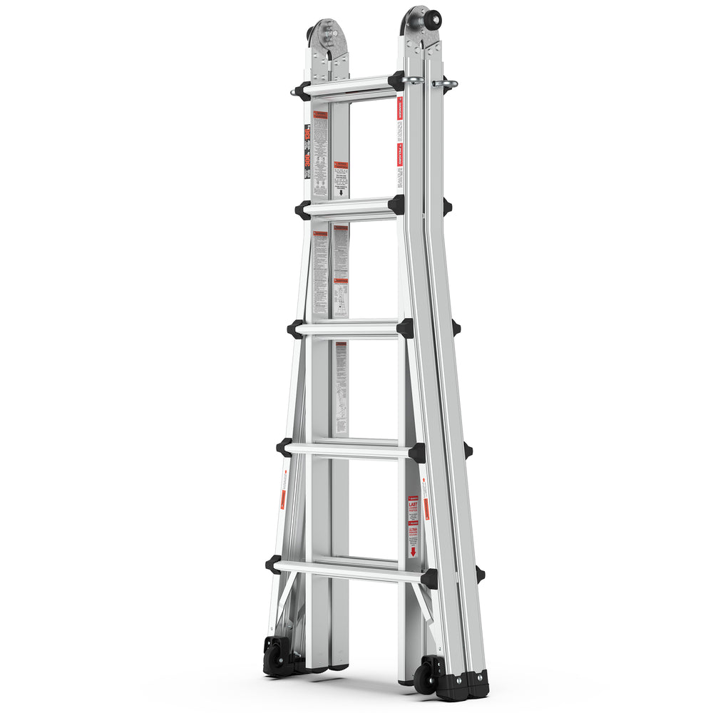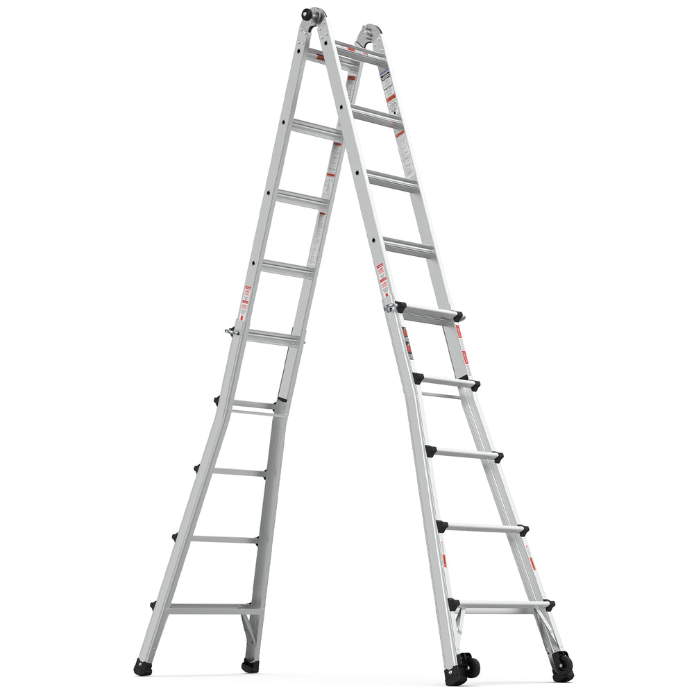 Upgrade your toolkit with this durable aluminum multi-position ladder, engineered to adapt to every job. Crafted from lightweight yet strong aluminium alloy, it effortlessly extends up to 22 feet, providing reliable access to hard-to-reach spaces. Its versatile design transforms into multiple configurations—A-frame, extension, trestle-and-plank, 90-degree angle, or staircase—making it perfect for both professional and home use. Equipped with large rubber feet and non-slip steps, this ladder ensures maximum stability and safety during every climb. Plus, integrated wheels make transporting this 38-pound (17.4 kg) ladder hassle-free, saving you time and effort on the job. Whether you’re painting, fixing, or building, trust this multi-position ladder for dependable support and convenience. Elevate your working experience today.