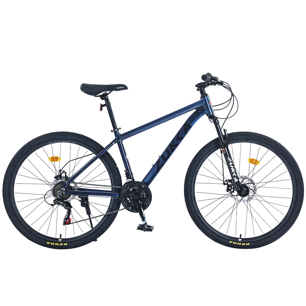 27.5 Inch Mountain Bike features a sturdy aluminium alloy frame, front suspension, and KENDA inflatable tires for shock absorption and traction. With 21 speeds and sensitive double disc brakes, it ensures smooth gear shifting and safe rides on diverse outdoor terrains.