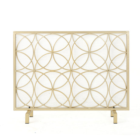 Single Panel Gold Iron Fireplace Screen With Geometric Design