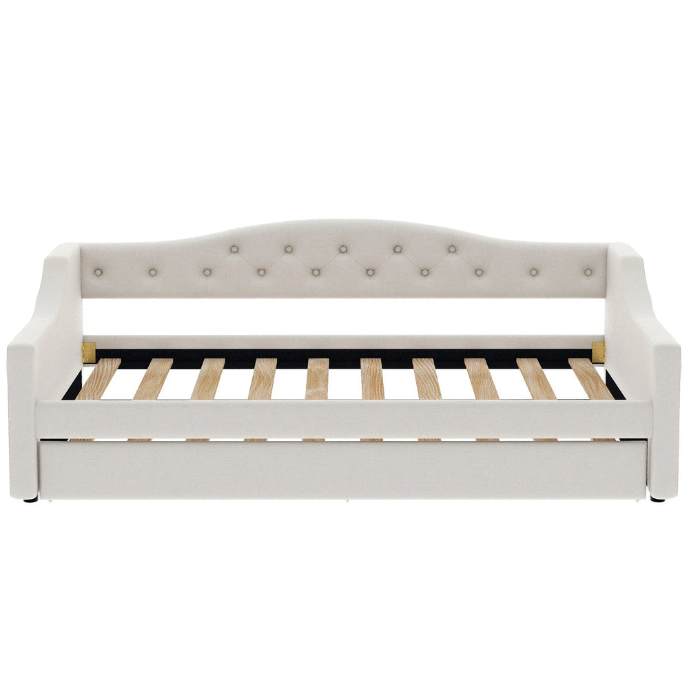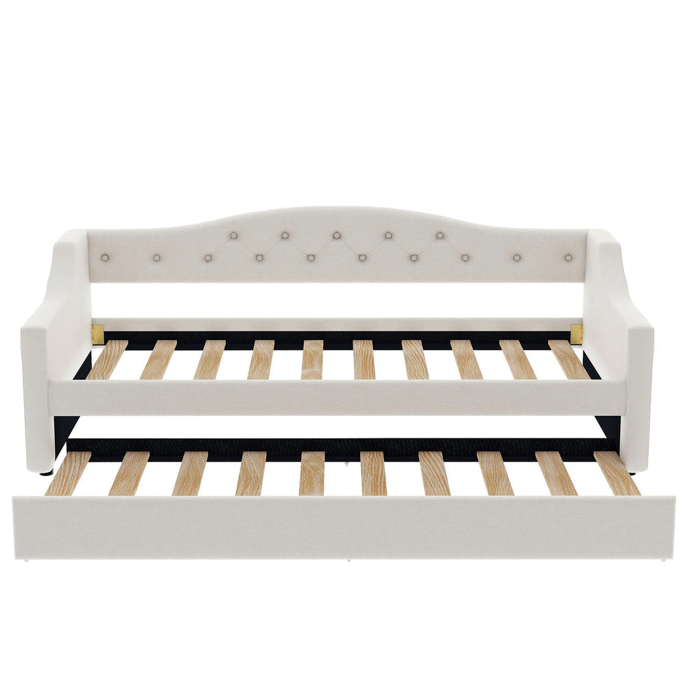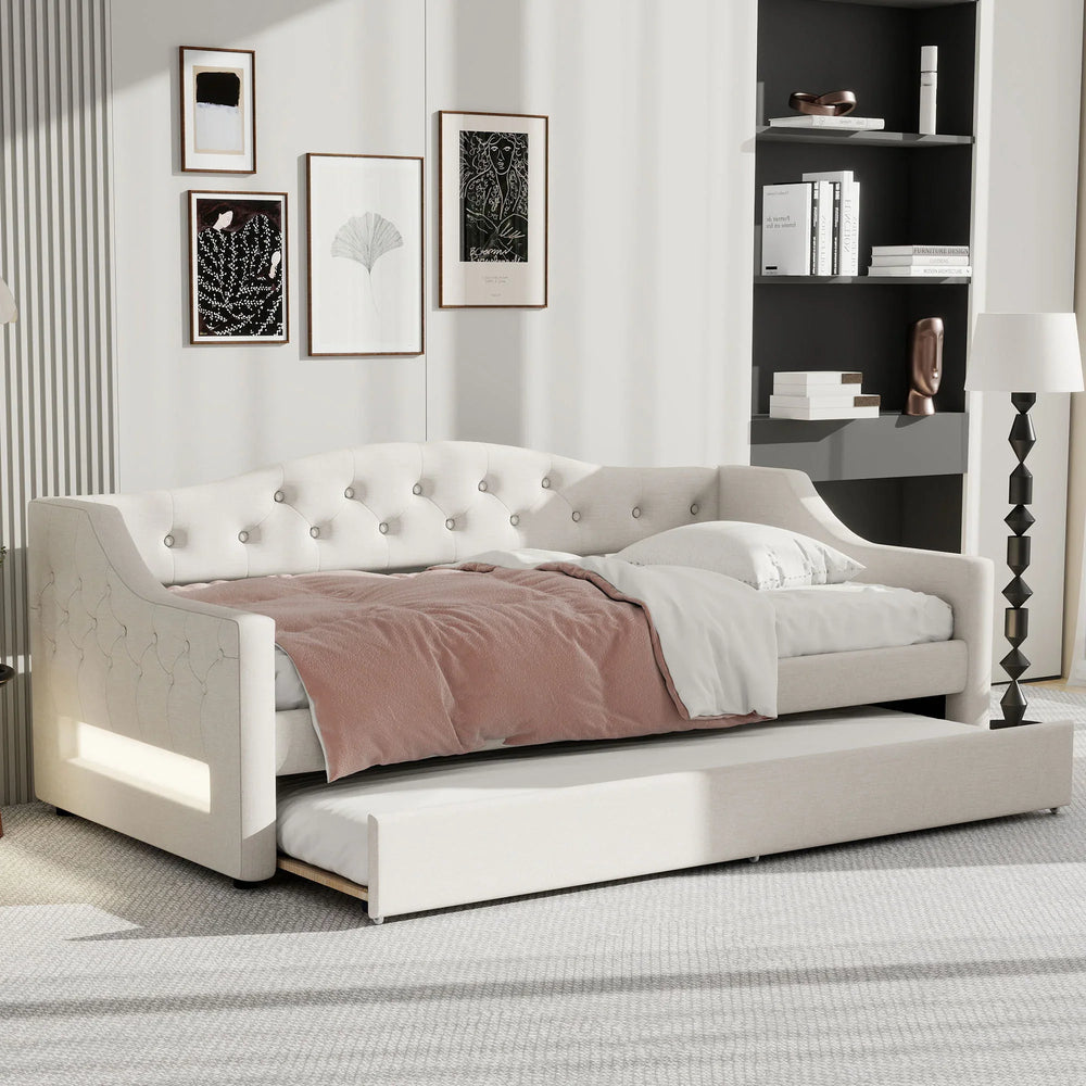 Designed to combine modern elegance and versatile functionality, this Twin XL upholstered daybed enhances any bedroom setting. Wrapped in soft beige linen, the padded backrest and sides offer cozy seating and restful sleep. The sturdy wood frame with linen slats provides reliable support without the need for a box spring, while the included trundle bed maximizes sleeping space for guests or overnight visitors. Featuring adjustable LED lighting on both sides with seven color options, this daybed adds a warm, customizable ambiance to your room. With an 84-inch length, 41.5-inch width, and 27-inch height, it fits comfortably in most spaces while supporting up to 250 pounds per bed. Elevate your room’s style and functionality with this multi-purpose daybed—perfect for lounging, sleeping, and entertaining. Bring home comfort and convenience today.