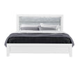 Modern full bed features a sleek white rubber wood frame with upholstered headboard, LED accent lighting, and headboard mirror accents for stylish relaxation and ambient lighting in the bedroom. Durable construction suits contemporary home decor.