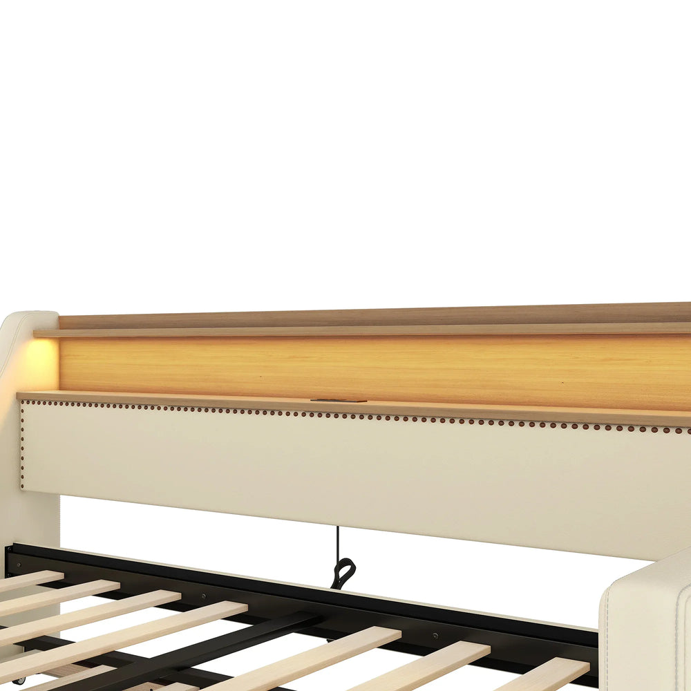 Twin PU Leather Daybed With Trundle Charging Station LED Light