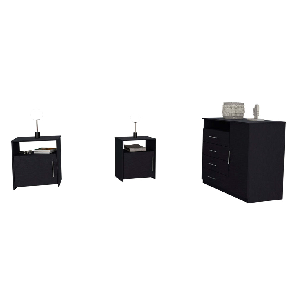 This 3-piece bedroom set includes a black particle board Rioja 4-drawer dresser and two Omaha nightstands featuring an intuitive interlocking mechanism, pre-drilled holes, and clear assembly instructions for easy, tool-free setup, offering durable and stylish bedroom storage.