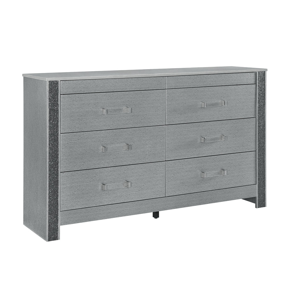 Crafted with solid rubberwood and MDF, the Lorenzo Silver Bedroom Set brings contemporary elegance and practical functionality to your space. Featuring glittered detailing that adds a subtle shimmer, this 5-piece set includes a queen-size panel bed with built-in lighting, a dresser with mirror, chest, and nightstand—all designed to enhance your bedroom's style and organization. The speaker integrated into the headboard post lets you enjoy music or podcasts right from your bed, creating a personalized retreat. Spacious drawers with sleek acrylic bar handles offer ample storage to keep your bedroom clutter-free. Require a box spring for optimal support and durability. With its silver finish and thoughtful design, this set combines fashion with convenience effortlessly. Transform your sleep space and enjoy both relaxation and style. Elevate your bedroom today.