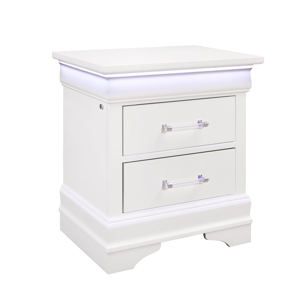Upgrade your bedroom with the Charlston White Bedroom Set, featuring a stunning sleigh style bed accented by integrated LED lighting for subtle ambiance. Crafted from durable rubberwood and MDF, this 5-piece set combines modern design with timeless charm. The pristine white finish brightens your space, while spacious drawers in the chest and nightstand offer ample storage to keep your room organized. Designed for a queen-size mattress and requiring a box spring, this set effortlessly blends style and function to create a serene and inviting retreat. Elevate your bedroom décor and enjoy lasting comfort today.