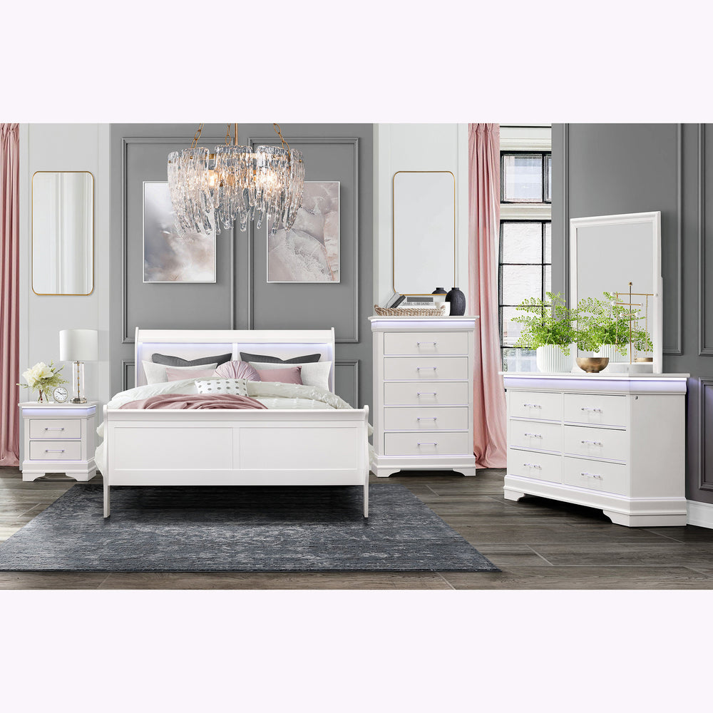 Omega Lifestyles 5-piece bedroom set features a modern sleigh style bed with built-in LED lighting, complemented by a dresser, chest, mirror, and nightstand crafted from durable rubberwood with a white finish, offering stylish storage and enhancing bedroom ambiance.