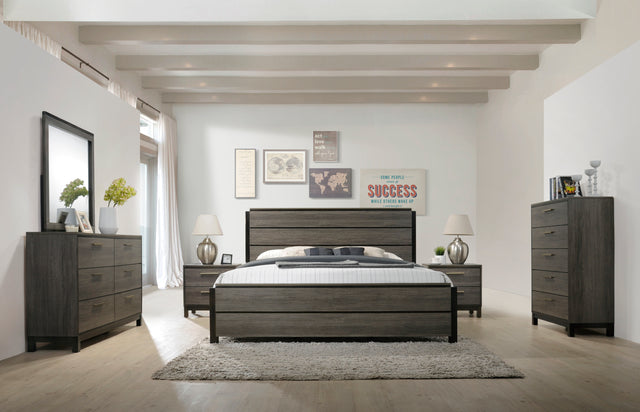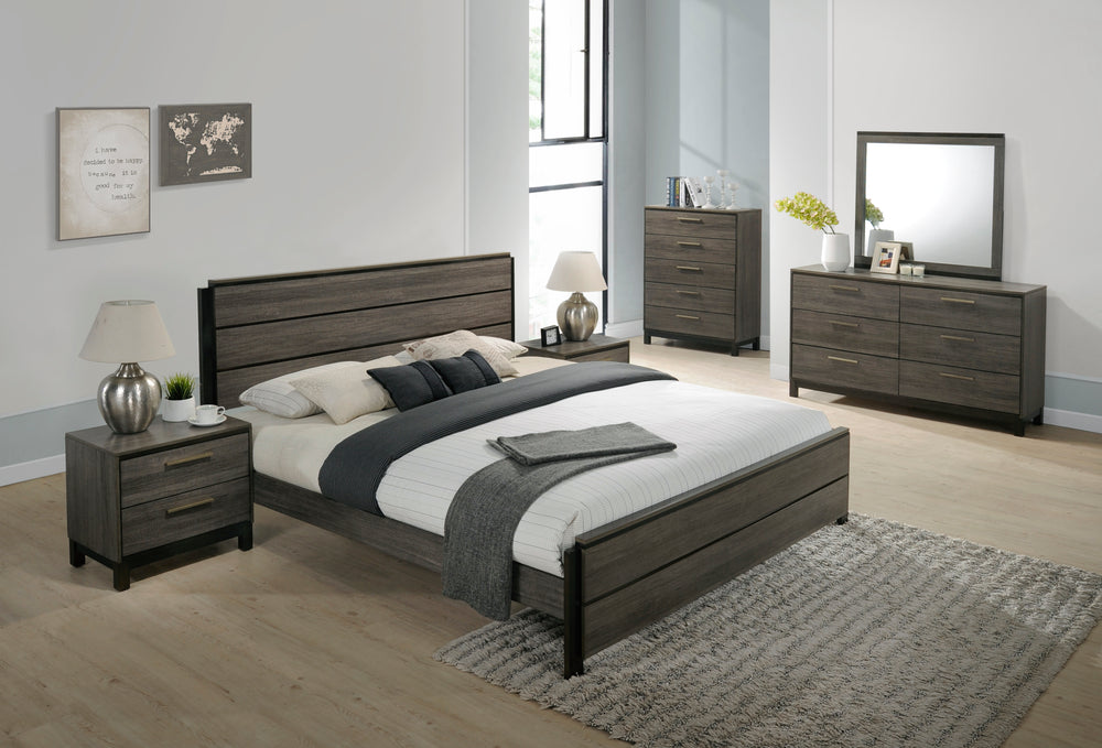 Contemporary six-piece bedroom set featuring a gray weathered rubberwood finish, including queen bed, dresser, mirror, nightstands, and chest. Designed for bedroom use with ample storage, sleek hardware, and low-profile bed requiring a separate box spring.