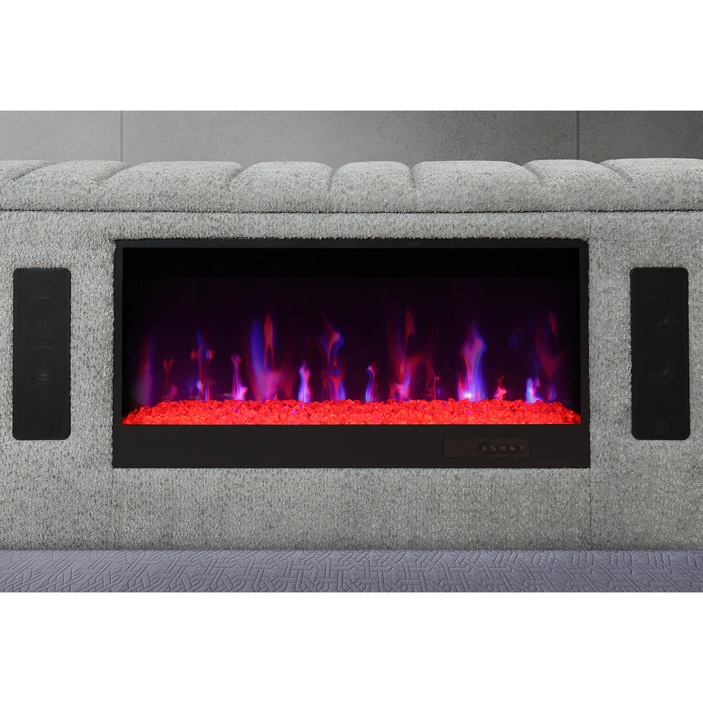 Upgrade your bedroom with this contemporary 5-piece King bedroom set, designed to blend elegance and smart functionality. The ultra-soft upholstered bed features a built-in 50" TV lift and embedded fireplace within the footboard, transforming your space into the ultimate retreat. Enjoy immersive sound through integrated speakers and set the mood with energy-efficient LED lighting. Crafted from durable solid wood and MDF with stylish polyester upholstery, this set also offers spacious storage with multiple drawers and includes a dresser, chest, nightstand, and mirror for complete bedroom organization. Combining advanced technology and thoughtful design, it delivers a seamless blend of comfort, convenience, and modern style. Elevate your living space today with this all-in-one bedroom solution.