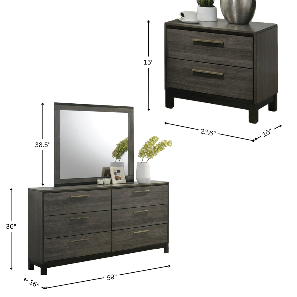 Bring contemporary elegance and timeless charm to your bedroom with the Ioana Antique Grey Wood Bedroom Set. Crafted from durable rubberwood with a sophisticated gray finish, this 5-piece set includes a king-sized low-profile bed frame, dresser, mirror, and two nightstands. The beautiful grain wood veneer and stylized inlay add refined texture while sleek hardware complements the modern design. With ample storage and a spacious mirror, this set transforms your bedroom into a serene and organized retreat. Please note, a low-profile box spring is required for the bed frame. Some assembly is needed to complete your stylish sanctuary. Create the bedroom of your dreams and elevate your comfort today.