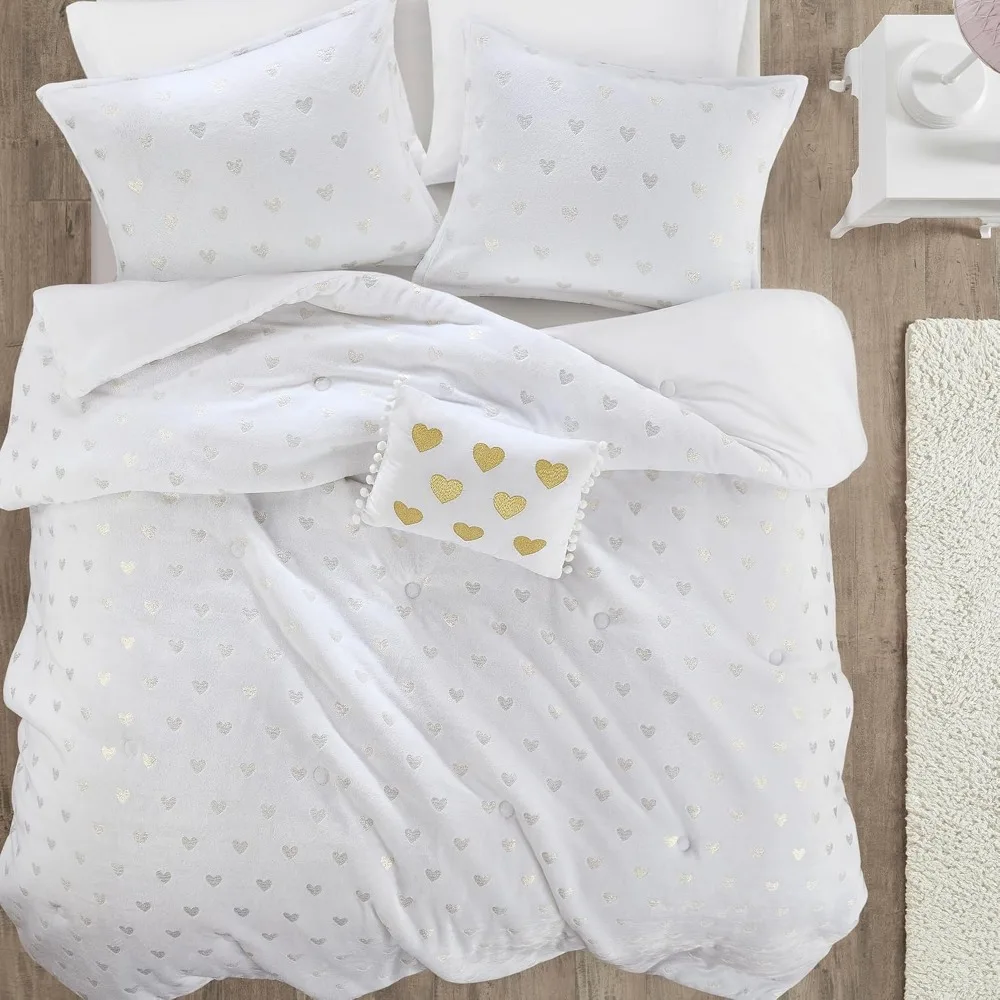 Searching for a comfortable, stylish, and cozy bedding set to enhance your bedroom? Experience ultimate relaxation with this plush comforter set, as users rave about its warmth and charming metallic heart design, making every night a delight.