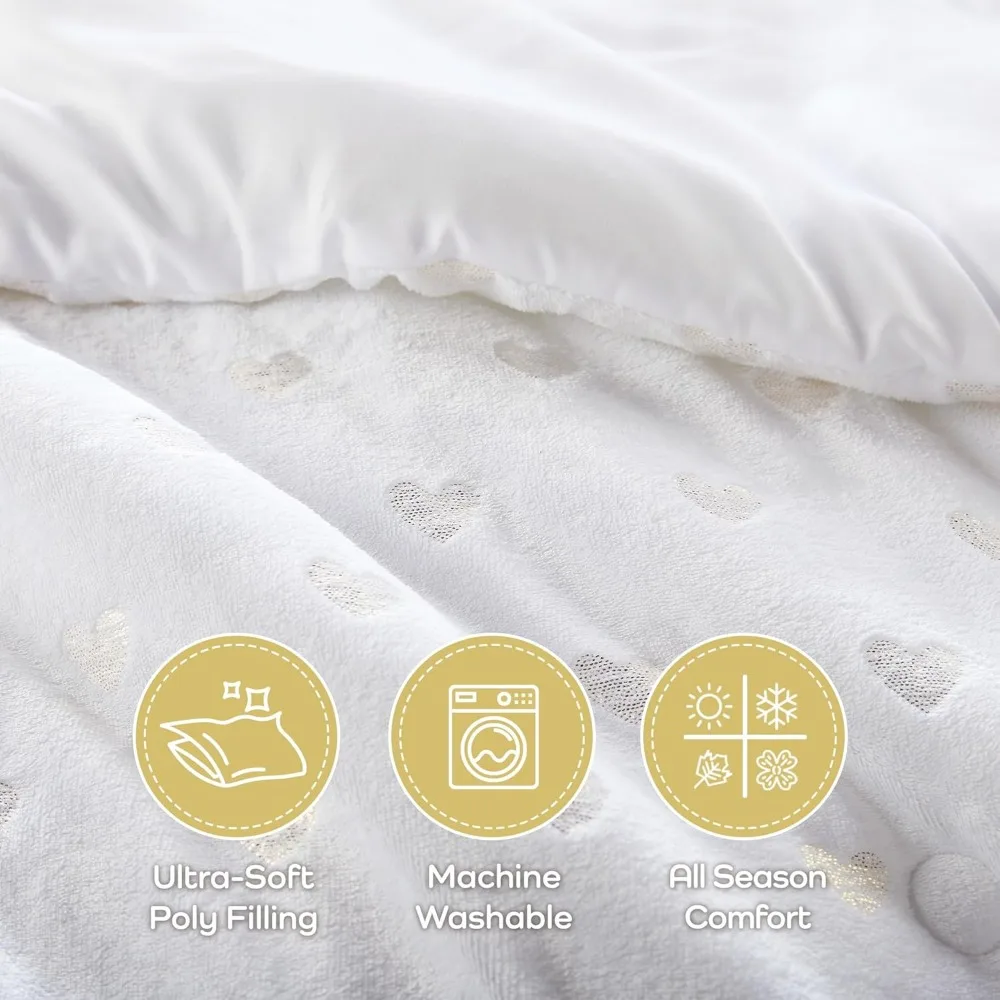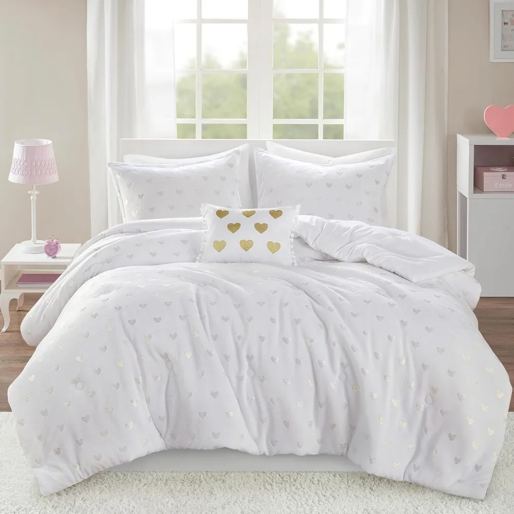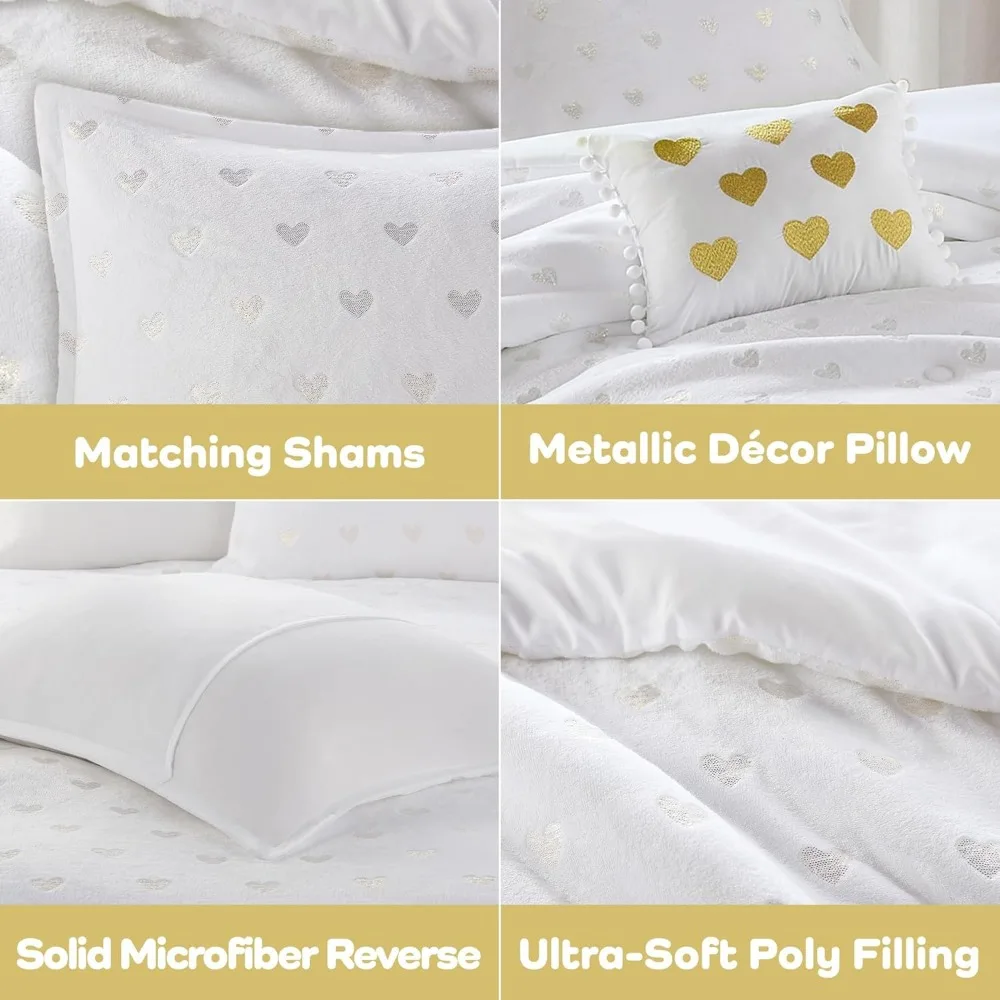 - Fun Metallic Hearts Bedding - The Queen-size comforter features an adorable metallic hearts décor on an ultra-soft plush cover, with a solid brushed microfiber reverse that complements the design beautifully with textural contrast