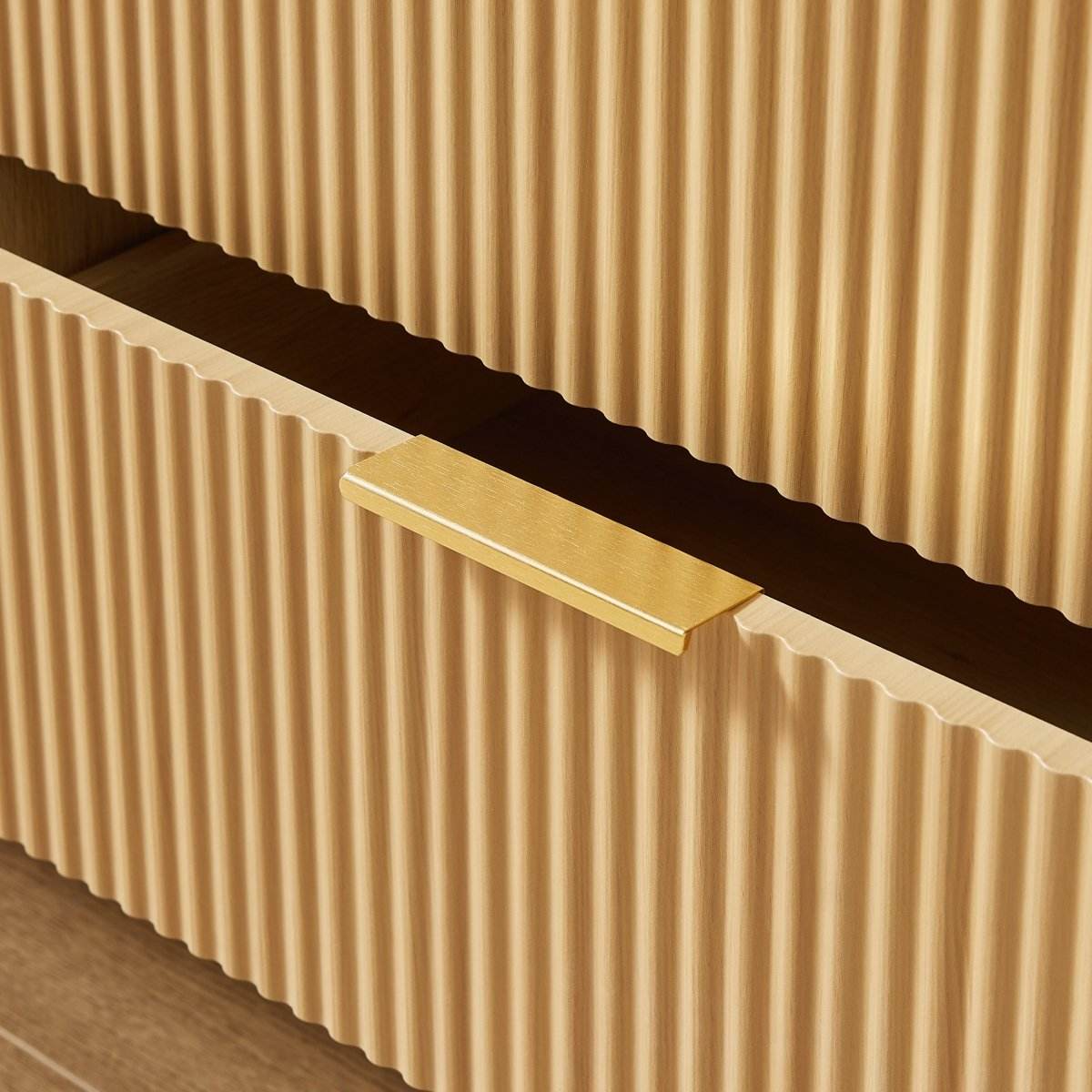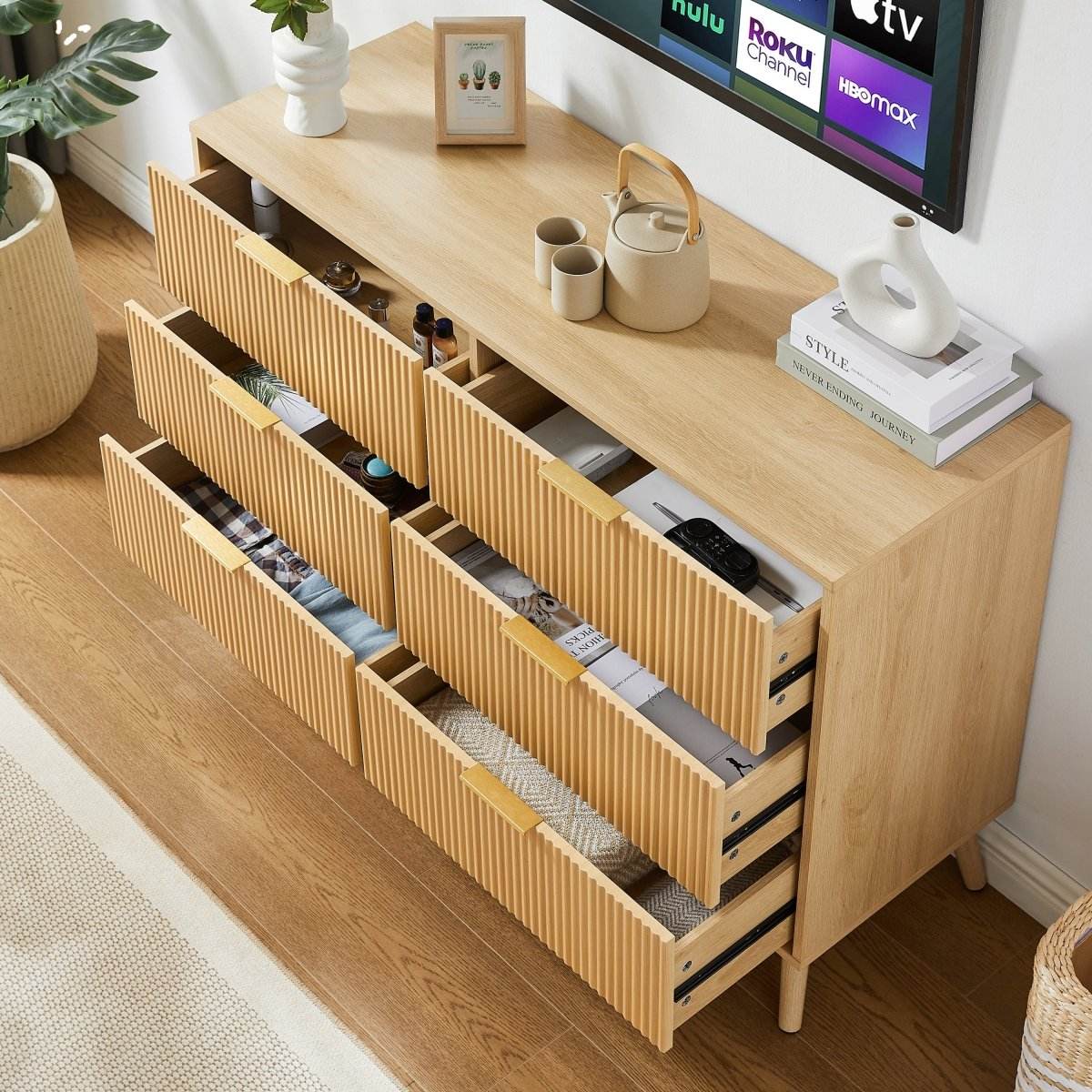 Natural wooden cabinet features six wave-pattern drawers with metal pulls for stylish, organized storage. Durable particleboard construction with stable legs and anti-tip safety makes it ideal for bedrooms, living rooms, and hallways, keeping spaces clutter-free and elegant.