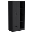 Maximize your bedroom storage with this modern armoire featuring a thoughtful combination of concealed and open shelving. Crafted from durable particle board with a smooth black finish, it blends style and function seamlessly. The spacious 71-inch (5.9 ft) height provides ample room for clothes and accessories, while the 1-drawer and 4-tier open shelves allow for easy access and display of your favorite items. Designed with everyday use in mind, its two doors keep belongings neatly tucked away, maintaining a clean and organized space. Ready-to-assemble with clear instructions and smart pre-drilled holes, this armoire offers hassle-free setup. Elevate your bedroom organization and refresh your space today.