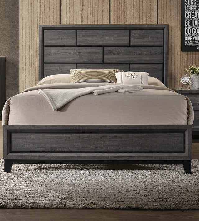 • Rustic gray finish enhances transitional style with box pattern headboard