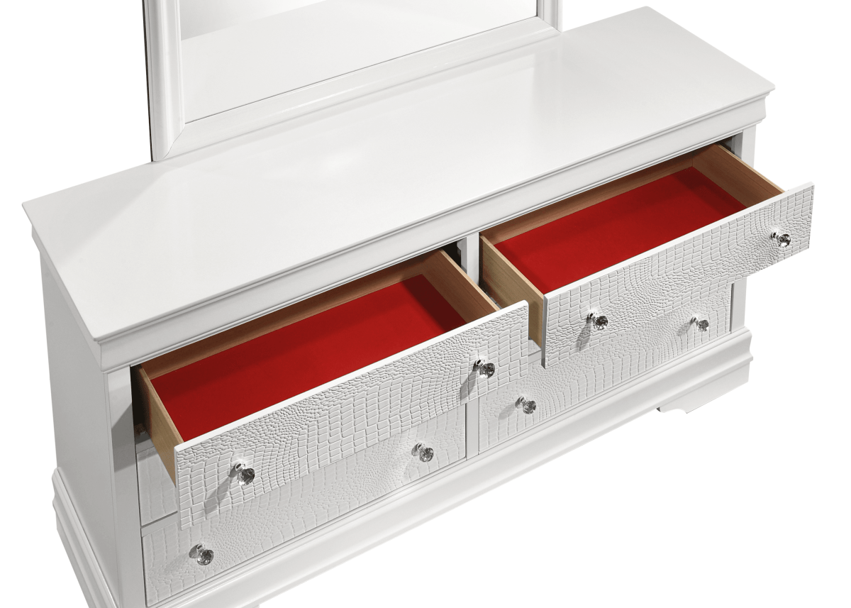 Transform your bedroom into a stylish and functional sanctuary with the Blaze 5-piece bedroom set in crisp white. Crafted from solid wood and MDF, this modern set offers a cohesive look with its sleek finish and textured detailing. The centerpiece bed features a tufted faux leather upholstered headboard with built-in LED lighting, adding both comfort and ambiance. Complement your space with practical storage solutions including a spacious dresser, mirror, nightstand, and an additional chest. Each piece showcases smooth-operating drawers lined with luxurious red velvet and crystal-like knobs for polished sophistication. Designed to blend effortlessly with contemporary decor, this set combines durability and style for lasting enjoyment. Elevate your bedroom today with this beautifully crafted ensemble.
