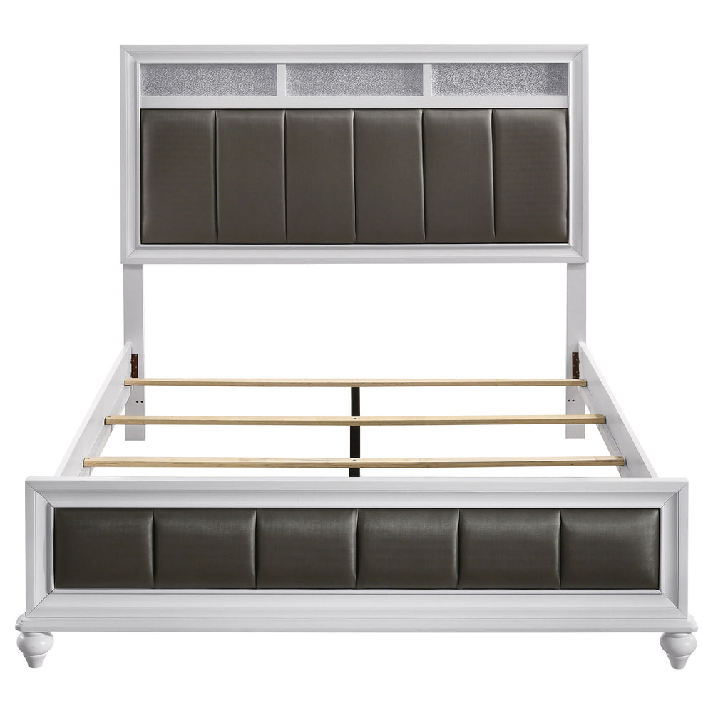Transform your bedroom into a stunning retreat with this classic-modern 4-piece queen bedroom set. Featuring a tailored tufted bed frame upholstered in metallic polyester, the crisp white wood construction brings a fresh, elegant look to your space. The set includes a spacious dresser and matching nightstand with glittering metallic acrylic drawer fronts and faceted crystal hardware that catch the light beautifully. A framed mirror completes the ensemble, reflecting both style and function perfectly. This carefully curated collection blends glamorous design elements with practical storage, elevating your bedroom with sophistication and rock & roll edge. Ideal for those seeking a bold yet timeless statement, this set creates a polished and inviting atmosphere. Elevate your bedroom style today with this eye-catching, durable wood furniture set.