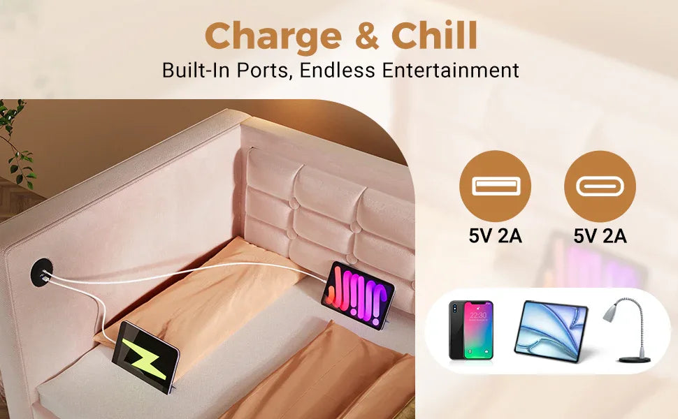 Charging Ports: USB and Type-C charging station on left bed board