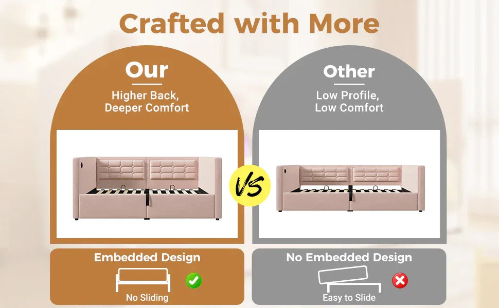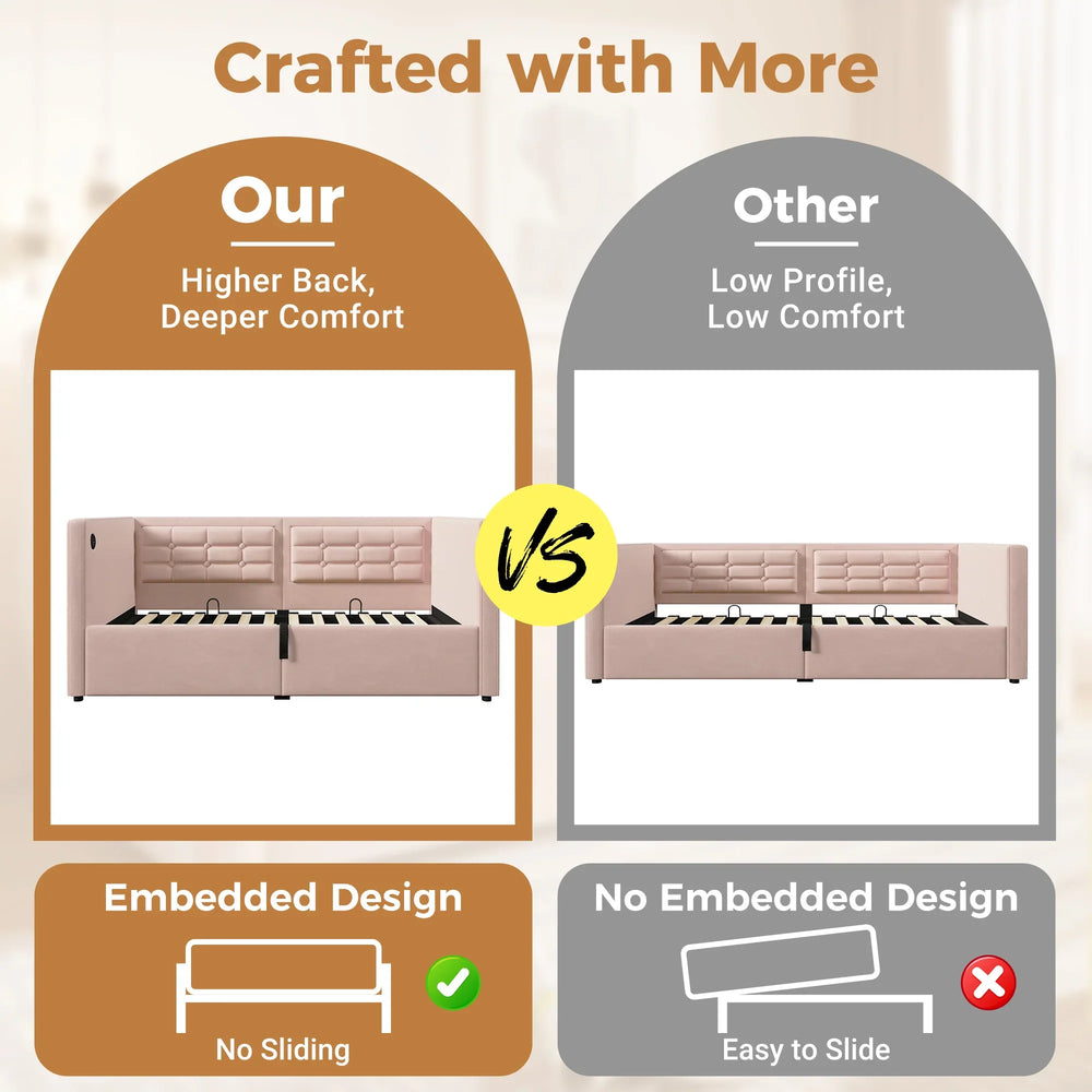 Elevate your living space with this elegant pink velvet twin daybed, blending cozy comfort with smart functionality. Upholstered in plush velvet, the bed features cushioned backrests on three sides, providing excellent neck and back support for lounging or sleeping. Its sturdy wooden slats ensure stable mattress support without the need for a box spring. The innovative hydraulic storage beneath the frame opens easily to hide away daily essentials, keeping your room tidy and organized. With built-in USB and Type-C charging ports, you can conveniently power your devices while you relax or rest. Perfect for small rooms or guest spaces, this twin size daybed combines fashion and function seamlessly. Assembly is straightforward with included tools and clear instructions. Add modern convenience and chic design to your home—upgrade your rest and relaxation today.