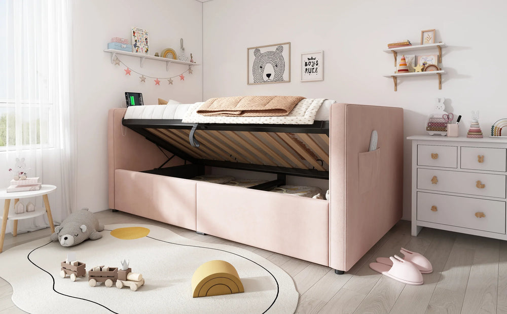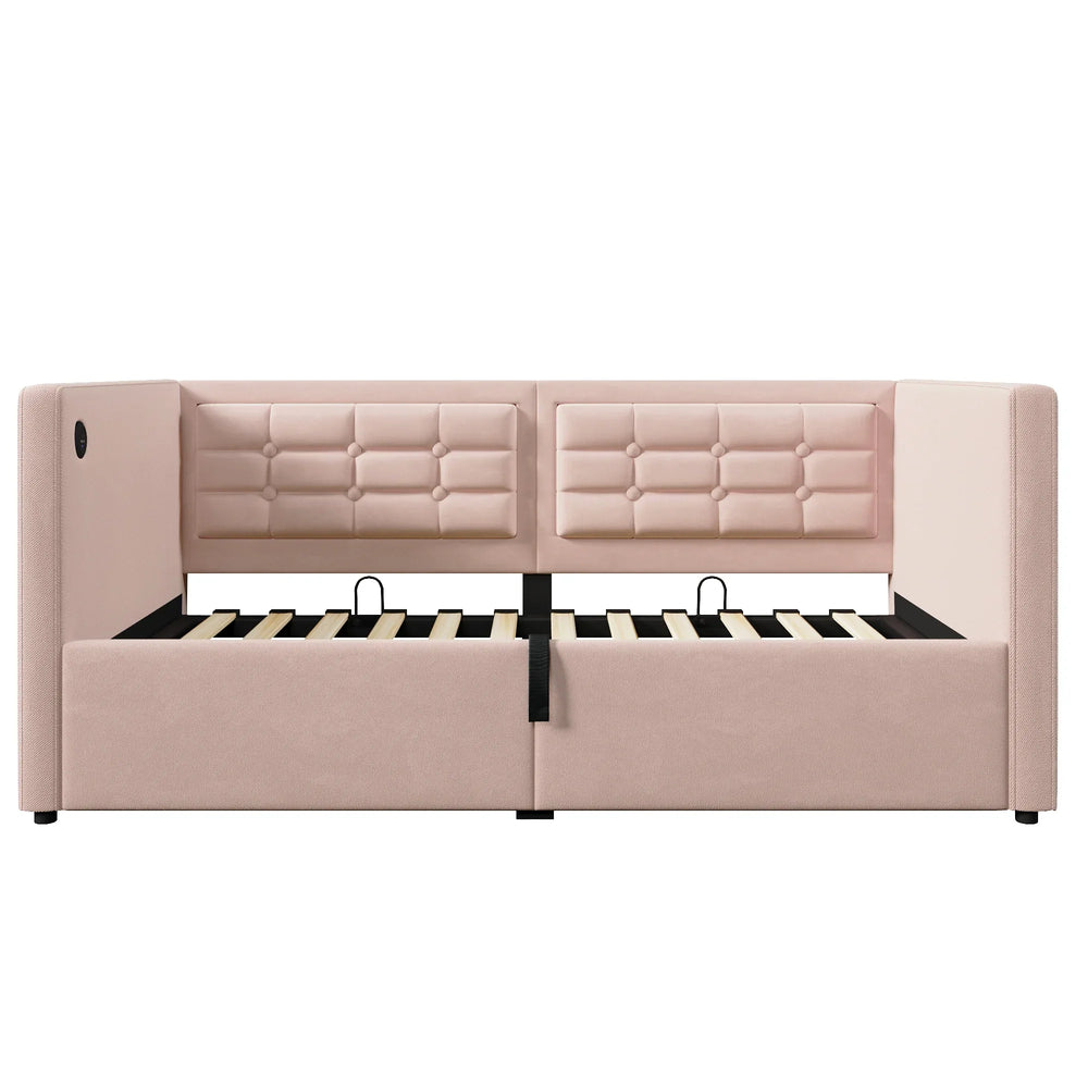 Pink velvet upholstered twin daybed features a hydraulic storage system, wooden slats for mattress support, and built-in USB plus Type-C charging ports. Its velvet backrests provide neck and back support, ideal for small spaces and modern bedrooms. Assembly required.