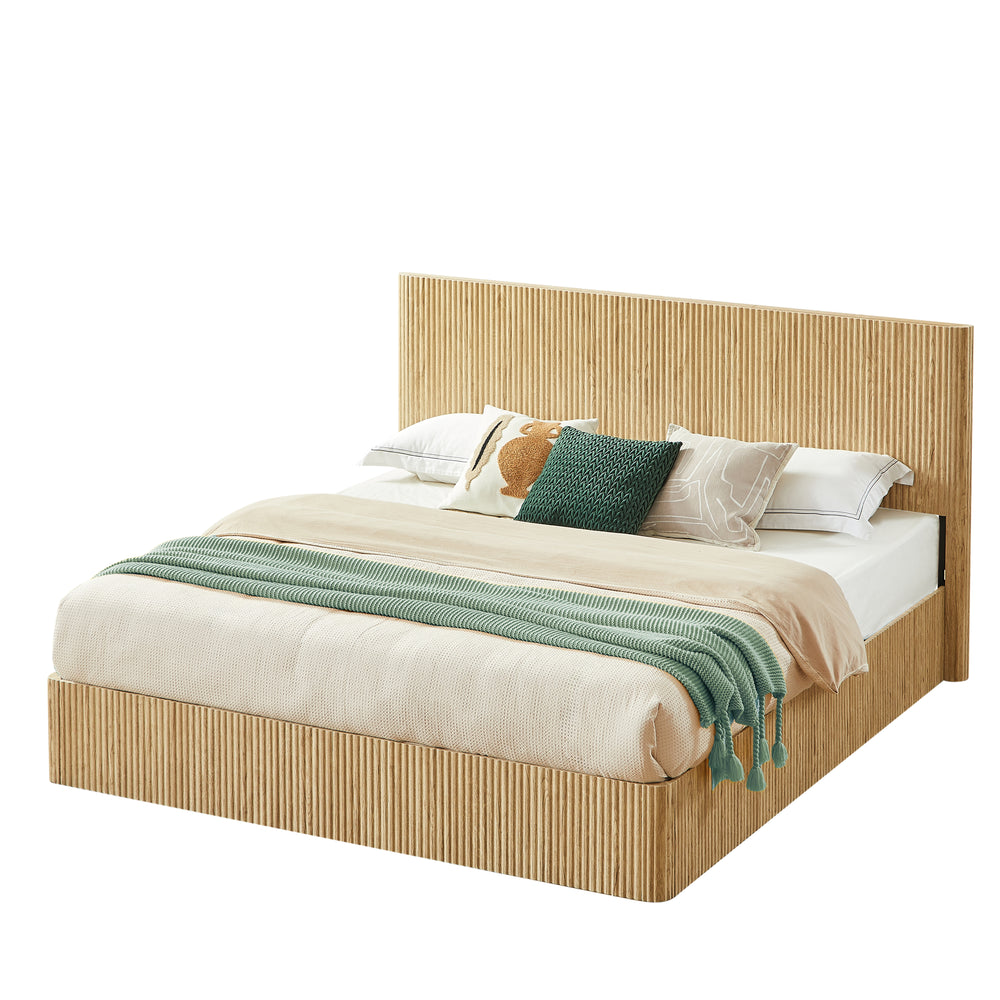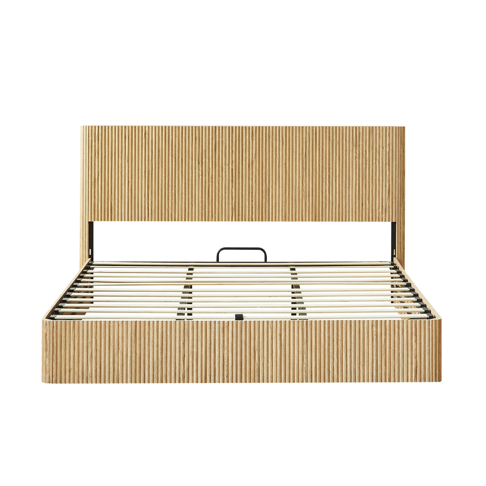 Maximize your bedroom’s functionality with this king size lift-up storage bed frame featuring smooth hydraulic gas springs for effortless access to ample under-bed storage. Crafted from durable MDF and iron, complemented by elegant oak-finish corrugated wooden panels, this bed frame blends rustic charm with modern style. Its graceful curved lines enhance any bedroom décor while the 12 micro-arched wooden slats provide superior support without the need for a box spring, ensuring a stable and quiet sleep surface. Perfect for optimizing small spaces or decluttering your home, this practical yet stylish frame supports up to 1,000 pounds (453.6 kg) and measures 83.2 inches long by 76.2 inches wide and 44.5 inches high. Easy to assemble with included tools and instructions, transform your sleep space and elevate your bedroom organization today.