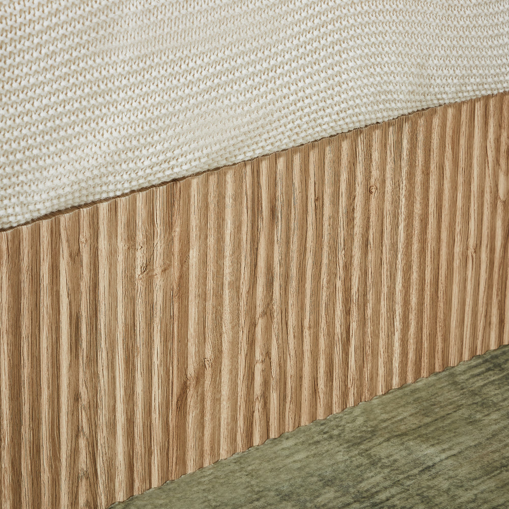 • Rustic Oak Finish: Features corrugated wooden accents with a modern curved profile.