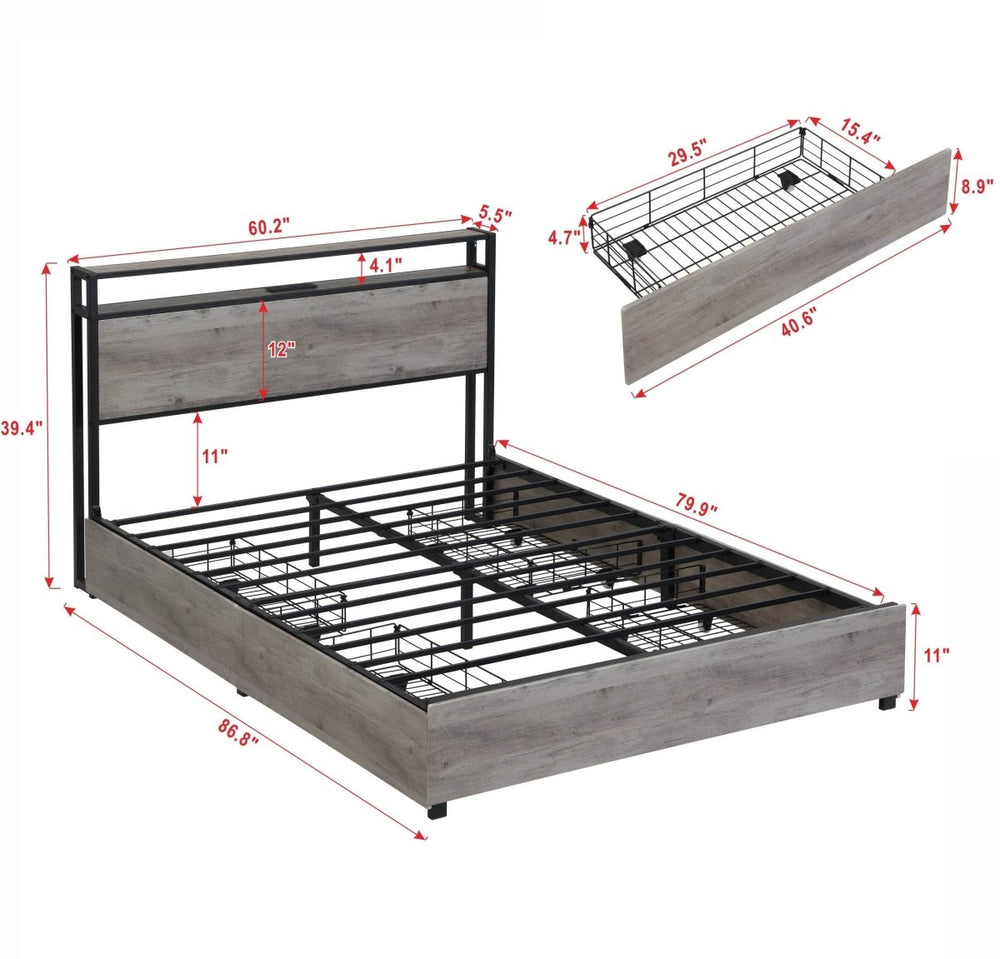 Queen bed frame features a durable metal and wood construction with practical storage headboard and four spacious drawers. Integrated charging station with USB ports and smart LED lighting enhances bedroom organization and ambiance. Easy assembly, noise-free, no box spring needed.