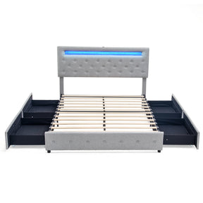 Experience the perfect blend of style and functionality with this modern upholstered platform bed frame. Featuring a breathable, wear-resistant linen fabric in classic light grey or dark grey, it complements any bedroom decor while offering durable comfort. The adjustable button-tufted headboard with customizable LED lighting creates a soothing ambiance, easily controlled via remote or smartphone app. Integrated USB ports keep your devices charged and within reach for convenience. Four spacious, wheeled storage drawers maximize bedroom organization by safely storing linens, pillows, and essentials while preventing dust and spills. Crafted with a sturdy steel frame supported by solid wood slats, this bed frame offers exceptional stability and supports up to 1,000 lbs. Easy assembly with included tools and instructions means you can quickly transform your sleep space. Elevate your bedroom comfort and organization today with this stylish, multifunctional LED bed frame.