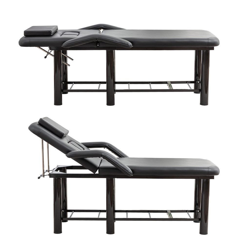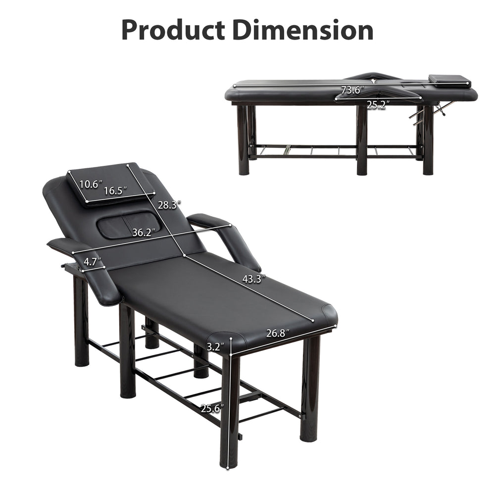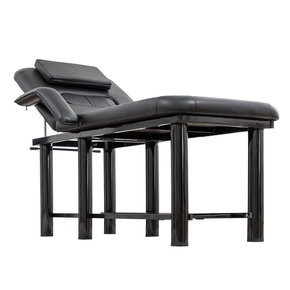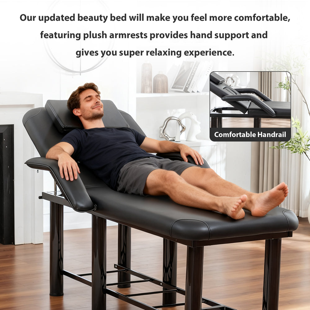 Elevate your spa, massage, facial, or tattoo sessions with this expertly crafted professional beauty bed. Upholstered in smooth, easy-to-clean black PU leather, it offers unmatched hygiene and effortless maintenance. The 3.2-inch thick high-density foam cushion ensures full-body support, allowing clients to relax deeply during extended treatments. Featuring a fully adjustable backrest reclining up to 30 degrees, removable headrest and breast cushions, plus height-adjustable legs, this bed adapts to every procedure and practitioner’s needs. Built on a sturdy steel frame with reinforced corners, it supports up to 600 pounds for durable, stable use in busy settings. Integrated plush armrests and a convenient storage shelf enhance both client comfort and workflow efficiency. Designed for versatility and long-lasting performance, this beauty bed is an essential addition to any professional treatment room. Elevate your practice and deliver superior care today.