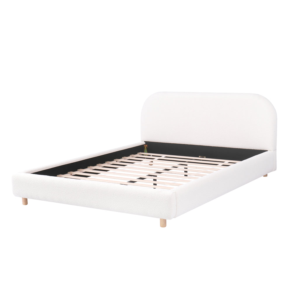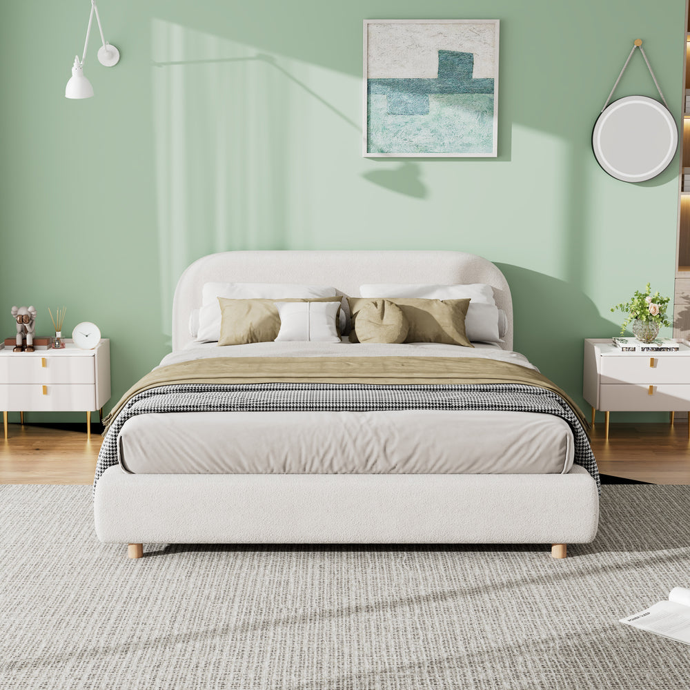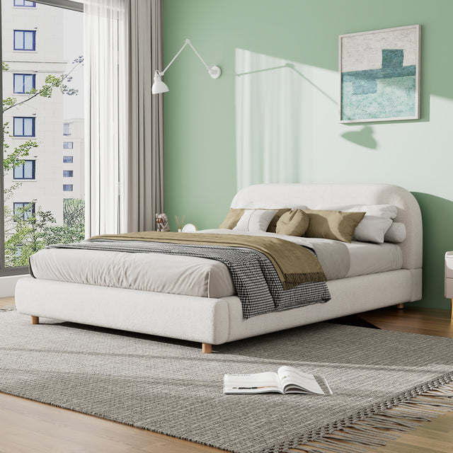 Create a serene and stylish bedroom retreat with this queen size upholstered bed frame, featuring soft boucle fabric that invites you to relax in cozy luxury. The plush foam upholstery cushions a thick, curved headboard designed for ideal back support and comfortable lounging. Built on a robust metal frame with wooden slats, this platform bed provides firm mattress support without the need for a box spring, perfect for mattresses 6 to 12 inches thick. Solid wood legs add lasting stability while complementing the elegant white finish that brightens any space. Quick and easy assembly means you’ll enjoy your new bed in no time. Elevate your sleep experience with the perfect blend of comfort, durability, and style.