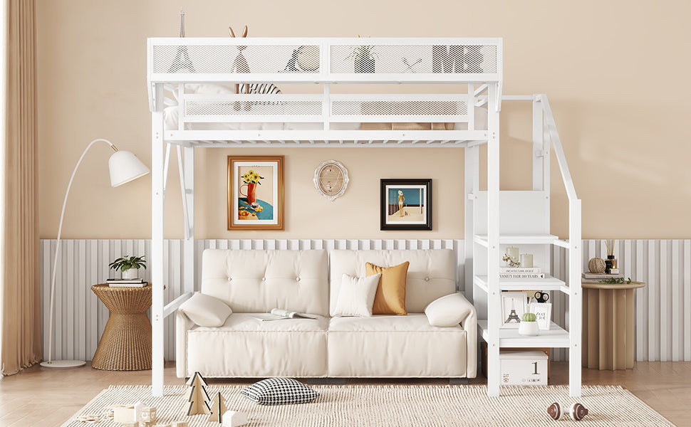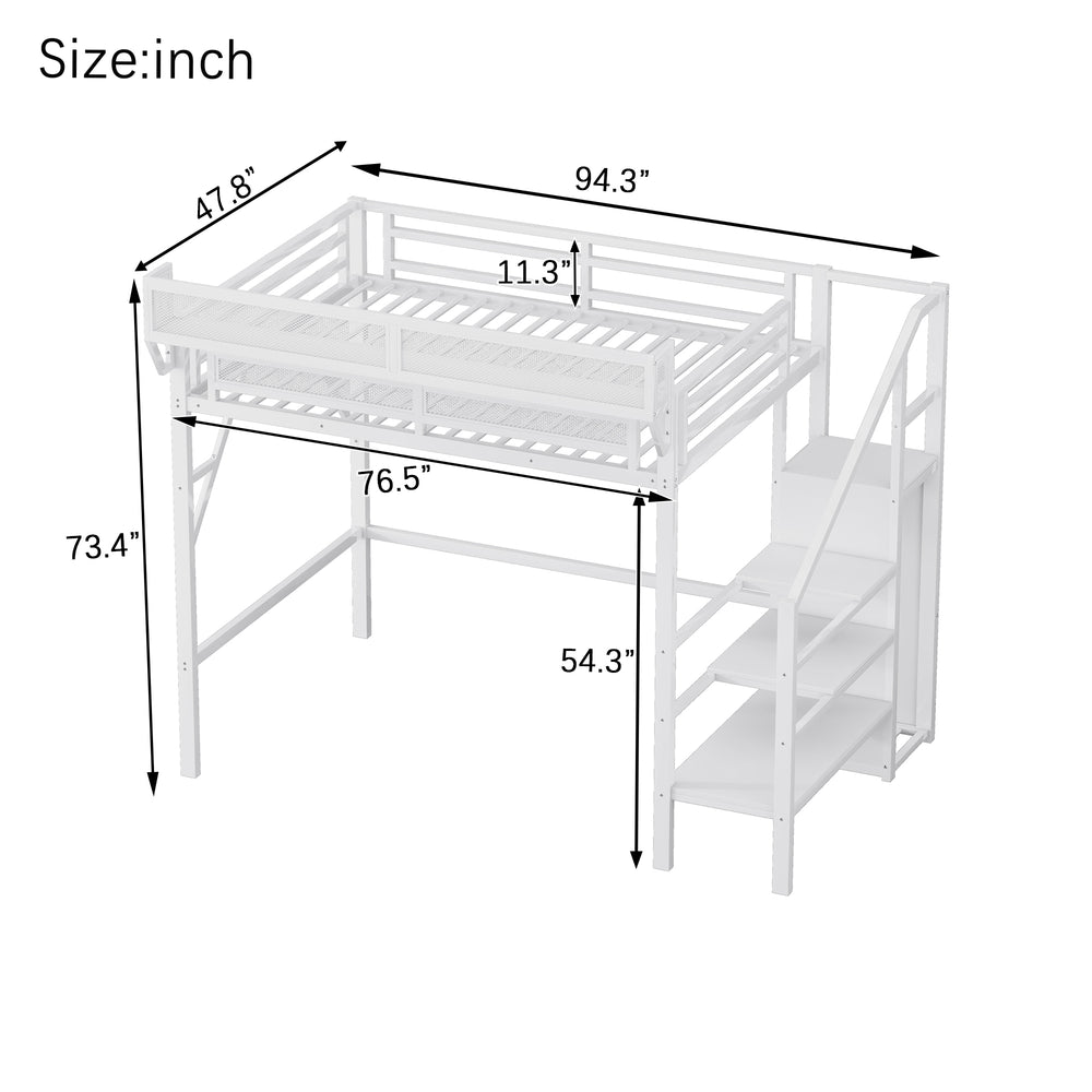 Revolutionize your kid’s or teen’s bedroom with this twin size metal loft bed, designed for durability and smart storage. Crafted from sturdy metal, its sleek white finish adds a modern touch while ensuring long-lasting stability. The high loft design creates 54.3 inches of versatile under-bed space, perfect for a desk, sofa, or extra storage solutions. Climb safely using the staircase, which features built-in storage compartments and a convenient wardrobe for clothes and accessories. The upper bed includes mesh-surrounded shelves to keep essentials within reach without clutter. Ideal for small spaces, this loft bed combines safety, functionality, and style to streamline your child’s room. Recommended mattress thickness is 6 inches (not included). Elevate your space-saving bedroom solution today.