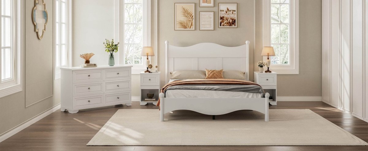 Bring timeless elegance and practical style into your bedroom with this retro-inspired 4-piece set. Featuring a queen-size platform bed crafted from durable wood with sturdy wooden slat support, it offers a firm and comfortable foundation without the need for a box spring. The sleek white finish and classic design create a cozy, vintage ambiance perfect for modern living. Included are two functional nightstands, each with spacious drawers and metal handles for easy access and stylish storage. Completing the set is a large dresser with six roomy drawers, ideal for organizing clothes and essentials while adding sophisticated charm. This cohesive collection effortlessly combines retro aesthetics with everyday convenience to transform your space. Assembly is simple with clear instructions and included tools—upgrade your bedroom today for lasting comfort and style.