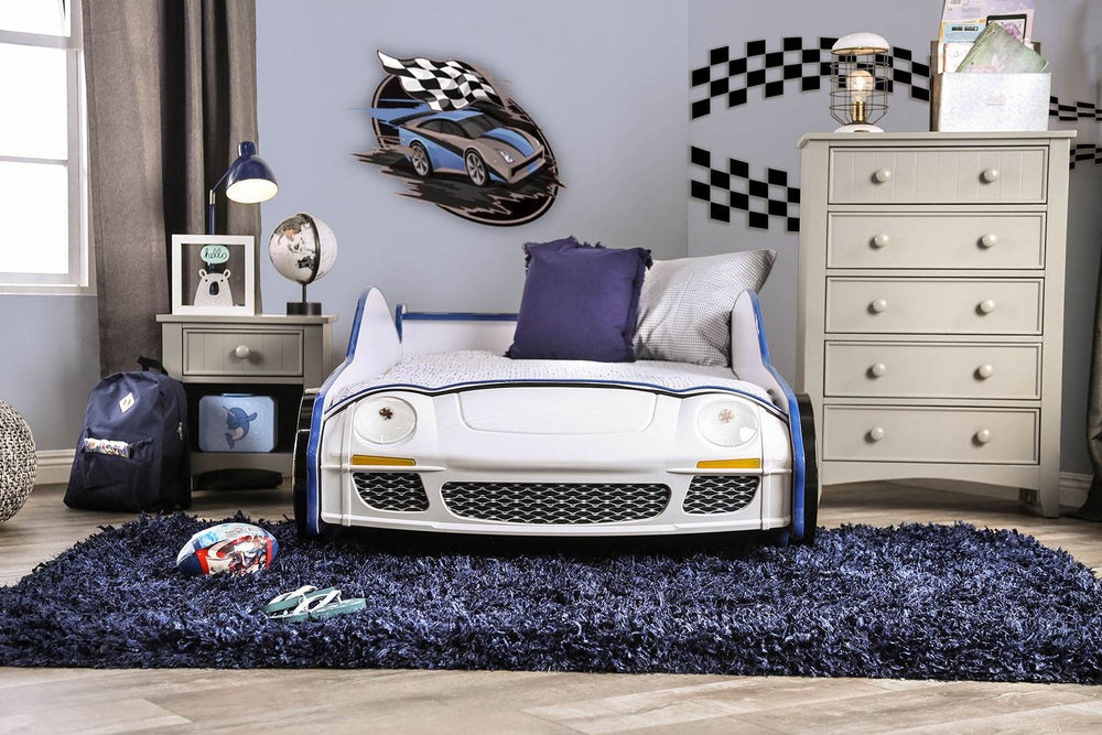 Turn bedtime into an exciting adventure with this Modern Novelty Police Car Twin Bed. Crafted with sturdy MDF and particle board, this kid’s bed features a dynamic race car design finished in vibrant blue and white high gloss. Functional LED lights on the headlights and wheels bring an authentic, playful glow to your child’s room, sparking creativity and fun as they drift off to sleep. The metal supports and painted edges ensure durability and safety, while the included slat kit offers easy mattress setup (mattress not included). Measuring 90 inches long by 45.5 inches wide and 25 inches high, this twin bed fits perfectly in any child’s bedroom and creates a standout centerpiece that blends modern style with youthful energy. Simple assembly turns your child's bedroom into a turbocharged zone—elevate their sleep experience today.