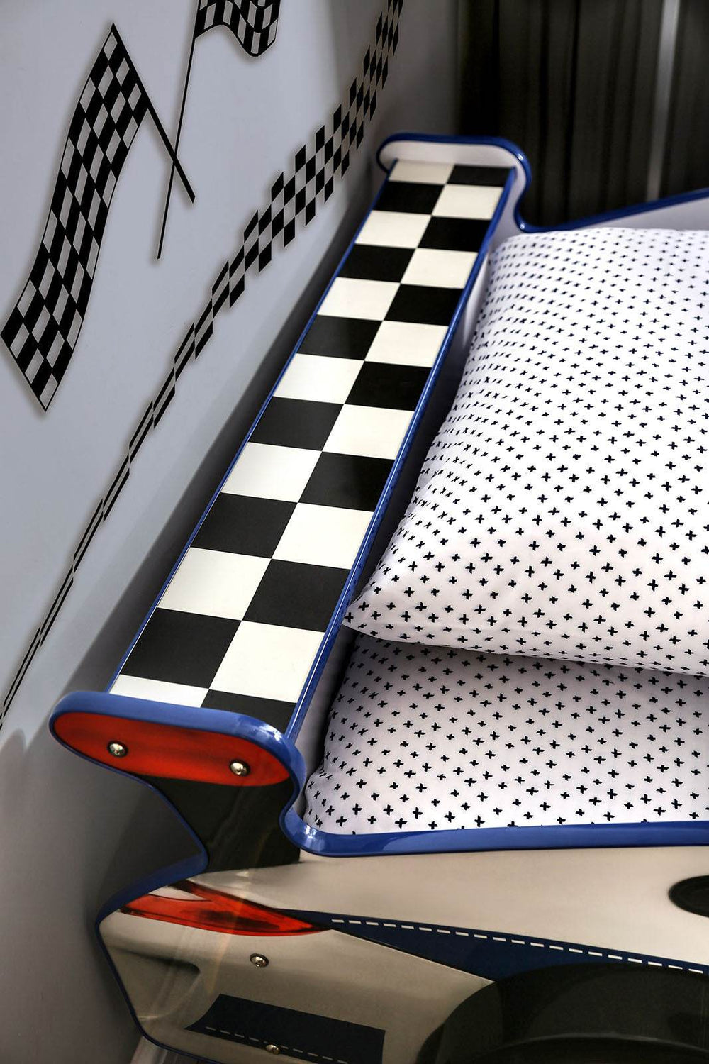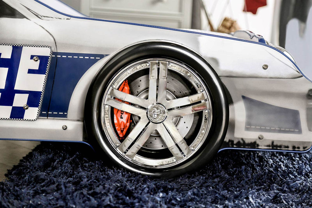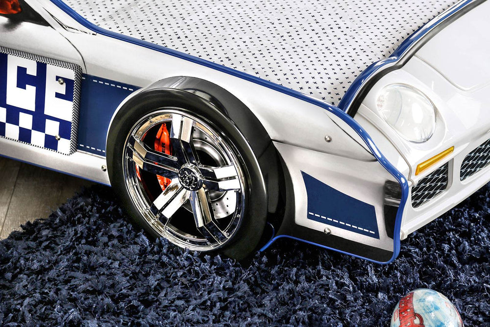 Modern twin bed with a novelty police car design featuring LED headlights and wheel lights, painted edges, metal supports, and high-gloss blue and white finish. Sturdy with included slat kit, ideal for children’s bedrooms and simple to assemble.
