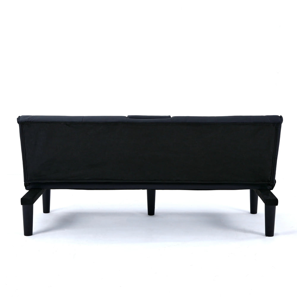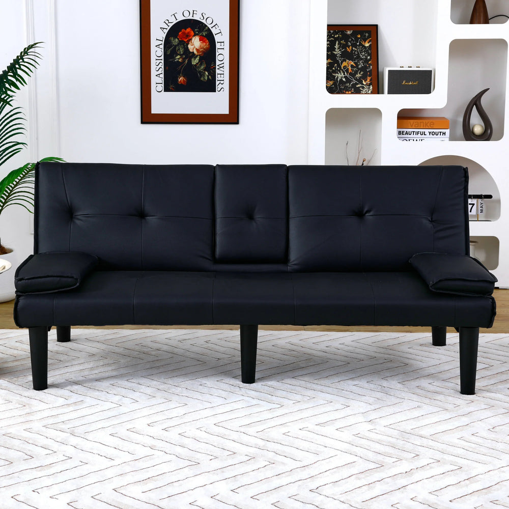 This versatile 2-seat black PVC sofa features a foldable design with a built-in cup holder, offering quick conversion between sofa and bed. Its compact 67-inch size fits small living rooms, dorms, and offices, providing practical comfort and flexible relaxation.