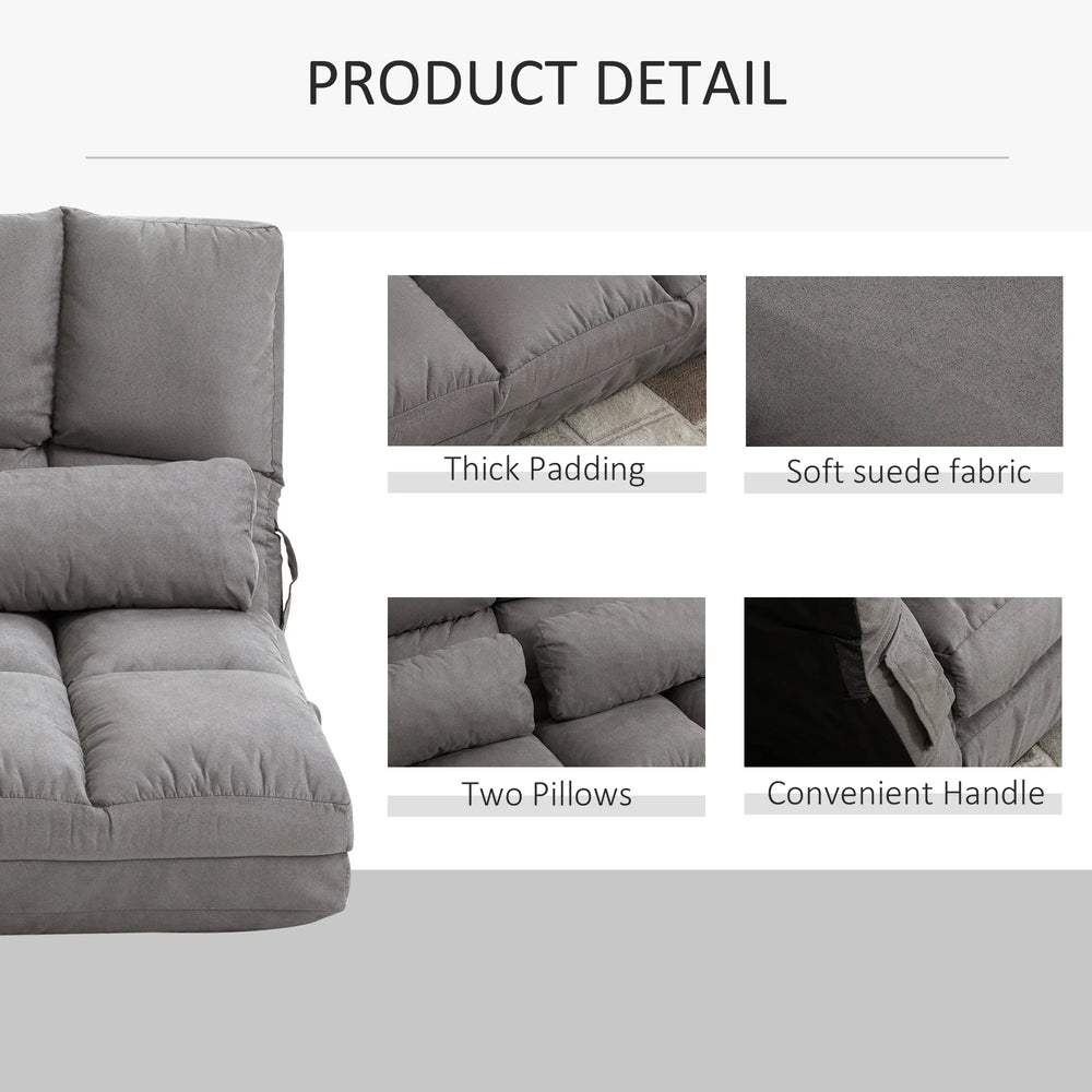 Convertible floor sofa chair features fully adjustable 5-level headrest and 3-level backrest for personalized comfort, doubles as a floor sofa bed, includes two pillows, foldable for space saving, and supports up to 264 lbs with a sturdy steel frame.