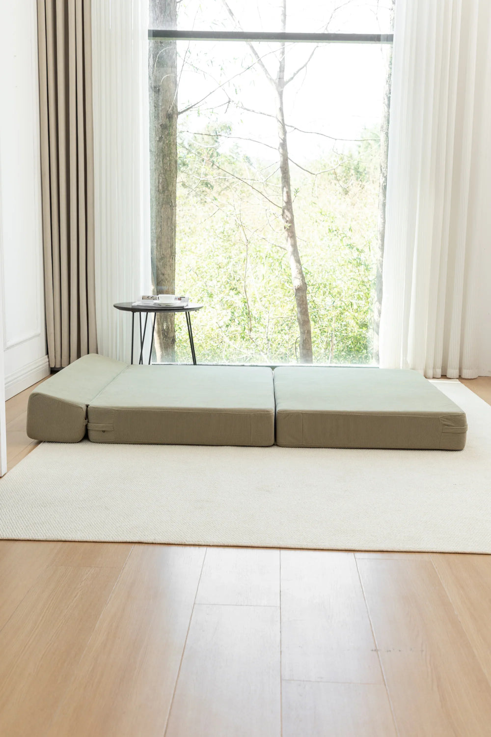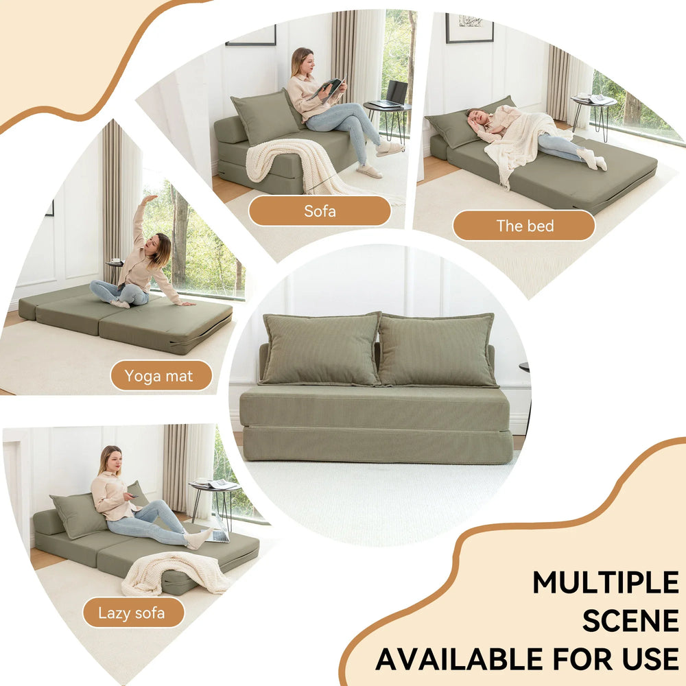 Transform your living space with this modern, foldable sofa bed that adapts to your lifestyle. Upholstered in soft green corduroy and filled with supportive foam, it offers medium-soft seating designed for all-day comfort. Whether you’re reading, working, or relaxing, it effortlessly converts between a two-seat sofa, chaise longue, lounger, or a cozy floor mattress, perfect for guests or dorm rooms. Its compact design fits seamlessly in small spaces like home offices and apartments, making it a smart solution for versatile living. Lightweight and easy to move, this sofa bed includes a contoured backrest and lumbar pillow to support your posture in every position. Ready to use right out of the box, it maximizes comfort and functionality while enhancing your space’s style. Elevate your home comfort today.