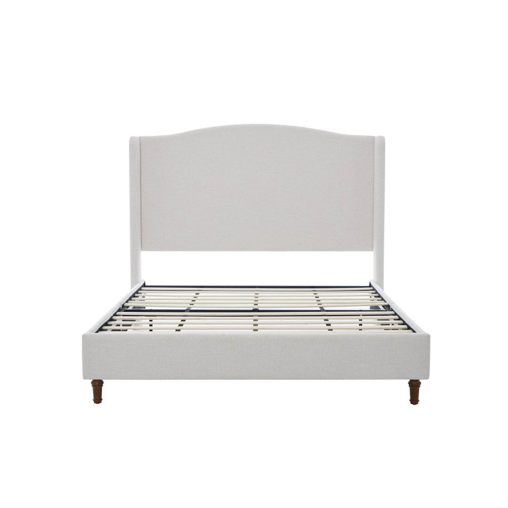 Elevate your bedroom with this minimalist design queen bed frame, featuring a striking 54-inch tall camelback headboard that serves as a sophisticated focal point. Softly curved wingbacks invite you to relax in comfort, while premium textured ivory chenille upholstery adds a refined, cozy touch. Crafted with a sturdy metal frame and solid oak wood feet finished in warm walnut tones, this bed ensures lasting durability and stability without the need for a box spring. The seamless footboard enhances your bedroom’s minimalist aesthetic, keeping your space clutter-free and elegant. Designed for easy assembly and built to support up to 1,000 lbs, this bed frame combines classic style with functional strength. Transform your sleep space today and indulge in comfort that complements your personal style.