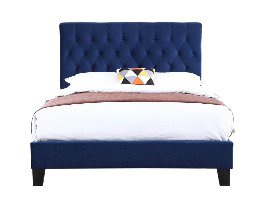 Blue full upholstered bed features solid wood construction with foam cushioning for enhanced comfort and durability. Its transitional navy design adds style and easy-care functionality, ideal for creating a relaxing bedroom atmosphere with a full-size fit.