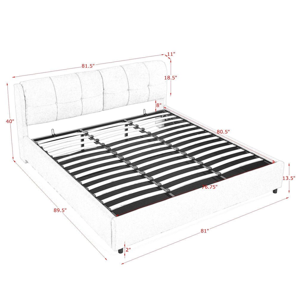 King size hydraulic platform bed frame features chenille upholstery with integrated padded headboard for added comfort, sturdy metal and wood construction, and large under-bed storage ideal for bedroom organization and space saving.