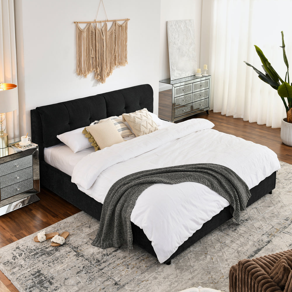 Upgrade your bedroom with this modern king size platform bed featuring plush chenille upholstery and a sleek integrated headboard. Designed for both style and function, the hydraulic lift storage compartment offers ample space for organizing clothes, linens, or personal items, keeping your room tidy and clutter-free. The soft, padded headboard provides cozy support, perfect for reading or relaxing before sleep. Crafted with a sturdy metal frame and solid wood slats, this bed frame ensures lasting durability and silent stability for restful nights. Easy to assemble with clear instructions, it’s a practical and elegant addition to any contemporary bedroom. Elevate your sleep space today with this luxurious black chenille bed frame that marries comfort with smart storage solutions.