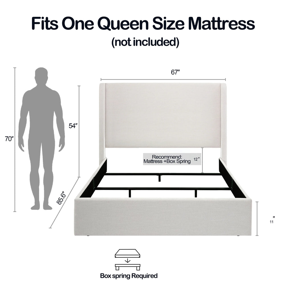 This queen-size upholstered wingback bed features a 54-inch tall textured ivory chenille headboard with soft curved wingbacks, blending minimalist and contemporary style. Its sturdy metal frame and foam cushioning offer quiet, comfortable support for bedroom relaxation. Box spring required.